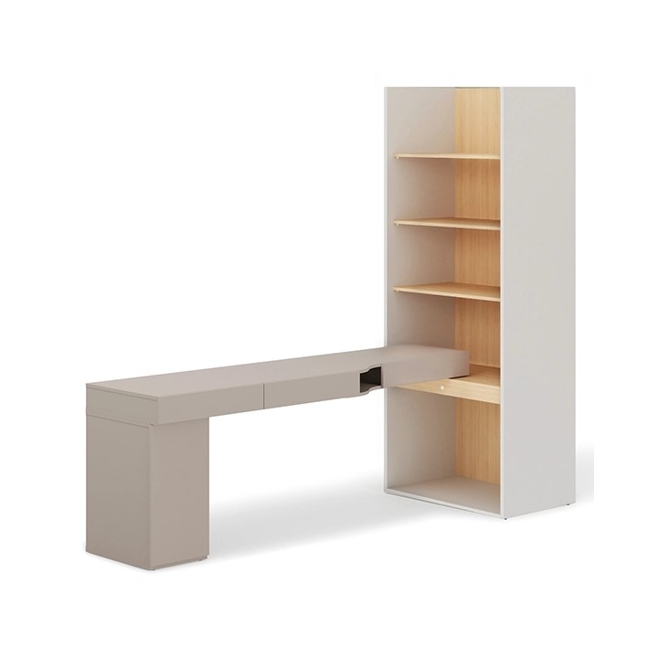 Meble powstały z myślą o młodych osobach, które potrzebują miejsca zarówno do nauki, jak i wypoczynku. W skład wyposażenia wchodzi aż 7 półek, które pomieszczą książki, akcesoria czy przedmioty codziennego użytku, a także 3 szuflady na drobiazgi oraz 1 front drzwiowy, skrywający dodatkową przestrzeń. Zastosowanie prowadnic kulkowych zapewnia płynność wysuwania szuflad, a detale takie jak uchwyty podchwyty i ślizgi PVC świadczą o dbałości o najmniejsze szczegóły.