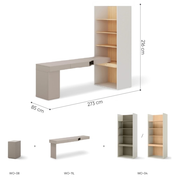 Zestaw SET-WOS9LVB z kolekcji WOOW to przemyślane rozwiązanie dla przestrzeni młodzieżowej, w której każdy metr kwadratowy jest na wagę złota. Kompozycja obejmująca kontenerek, biurko lewe oraz szeroki regał zajmuje 273 cm szerokości, 216 cm wysokości i 85 cm głębokości, co czyni ją odpowiednią do niewielkich wnętrz, nie rezygnując przy tym z komfortu codziennego użytkowania. Całość utrzymano w nowoczesnym zestawieniu barw: szampański, dąb vincenza bielona oraz clay grey, które nadają przestrzeni wyrazistego, a zarazem subtelnego charakteru.