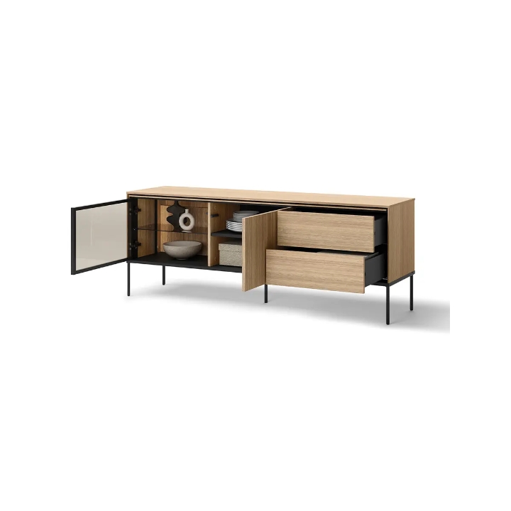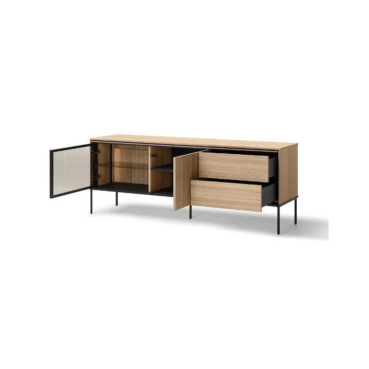 Wysoka jakość wykonania komody zapewnia jej trwałość na wiele lat. Mebel ma szerokość 167 cm, wysokość 62 cm i głębokość 41 cm. Został zaprojektowany z myślą o łatwym dostępie do sprzętu multimedialnego i akcesoriów. Wyposażono go w 1 półkę szklaną w kolorze brązowym antisol która pomieści wszystkie niezbędne urządzenia RTV. Dwie szuflady oraz drzwi z zawiasami puszkowymi klipowymi oferują dodatkowe miejsce na drobniejsze akcesoria.