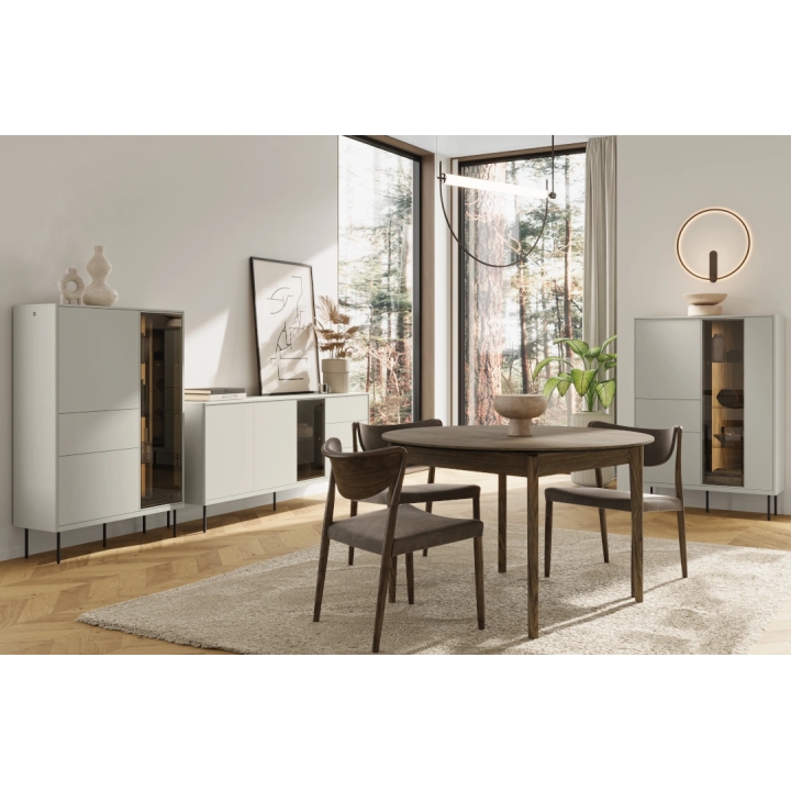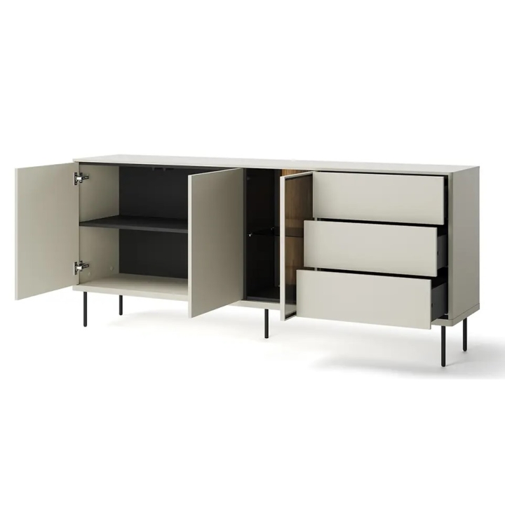 Metalowe nóżki w kolorze czarnym nadają całości kontrastu, podkreślając nowoczesny design mebla. Komoda Epiro doskonale sprawdza się jako element wyposażenia salonu, oferując przestronność oraz estetyczne detale. Dzięki swojej przemyślanej konstrukcji, komoda Epiro doskonale komponuje się z nowoczesnymi aranżacjami wnętrz. Jej minimalistyczna forma, w połączeniu z praktycznymi funkcjami i wysokiej jakości materiałami, sprawia, że jest to mebel godny uwagi dla osób szukających rozwiązań do swojego salonu.