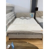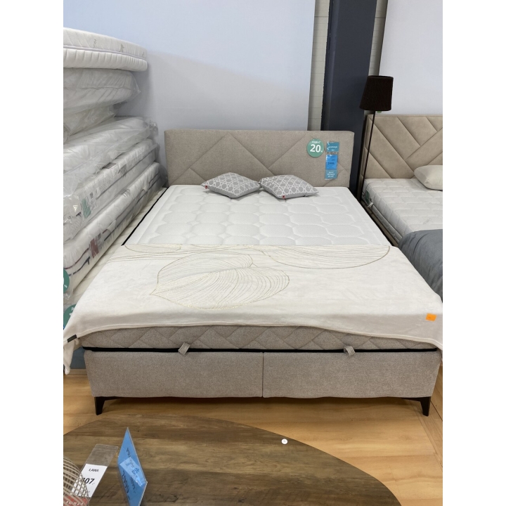 Wezgłowie pokryte tkaniną o przyjemnej strukturze zdobi ozdobne przeszycie, nadające całości wyraźny akcent dekoracyjny. Pod stelażem znajduje się pojemnik na pościel podzielony na dwie części, do którego dostęp ułatwiają siłowniki gazowe. Takie rozwiązanie umożliwia przechowywanie kołder, poduszek lub innych tekstyliów bez konieczności dodatkowych mebli.