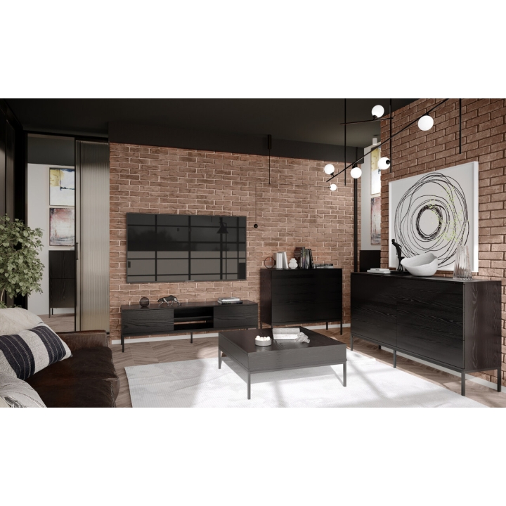 Korpus wykonany został z wysokiej jakości płyty meblowej w odcieniu czerni o wyrazistym usłojeniu. Materiał ten wiernie odwzorowuje wygląd naturalnego drewna, a jego powierzchnia zachowuje odpowiednią trwałość. Połączenie z metalowym stelażem wzmacnia całą konstrukcję i podkreśla jej nowoczesny charakter.