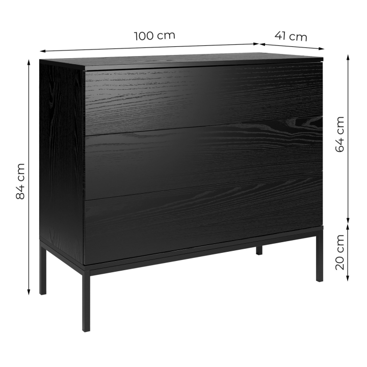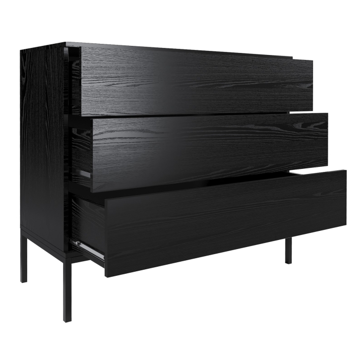 Wyposażona została w 3 pojemne szuflady o szerokości wewnętrznej 90 cm i głębokości 33 cm, co pozwala na przechowywanie wielu przedmiotów codziennego użytku. Mechanizm push to open wraz z prowadnicami o pełnym wysuwie zapewnia swobodny dostęp do całej zawartości. Dzięki temu komoda jest wygodna w obsłudze i ułatwia utrzymanie porządku.