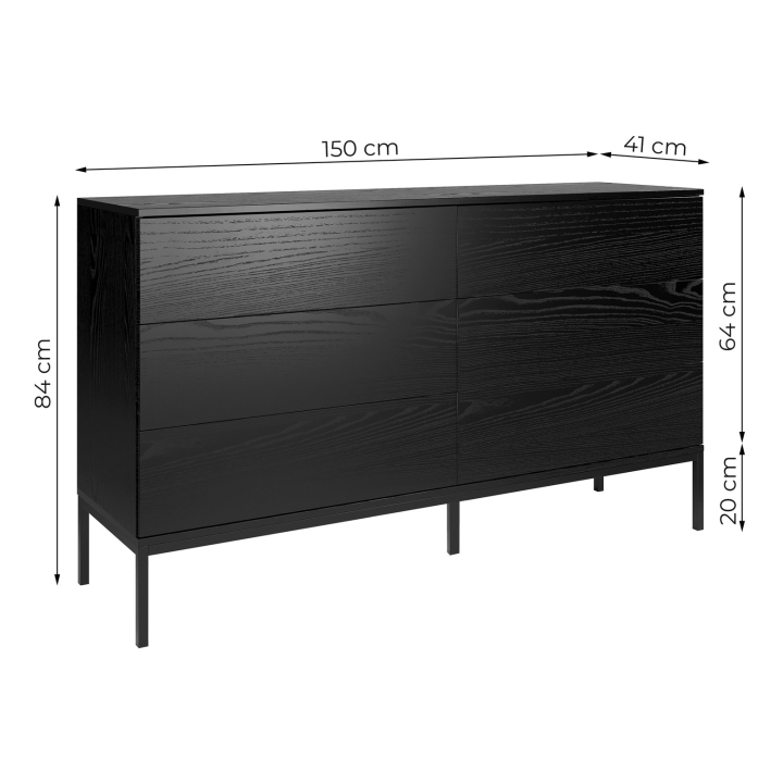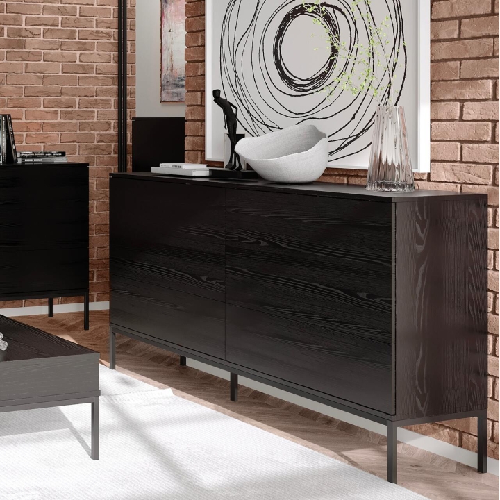 Metalowe nogi wykonane z profilu o czarnym wykończeniu są istotnym elementem konstrukcyjnym i estetycznym. Nadają komodzie stabilność oraz podkreślają spójność formy. Zastosowany w całej kolekcji system Push to open eliminuje potrzebę stosowania uchwytów, co pozwala utrzymać prostą, uporządkowaną linię frontów.