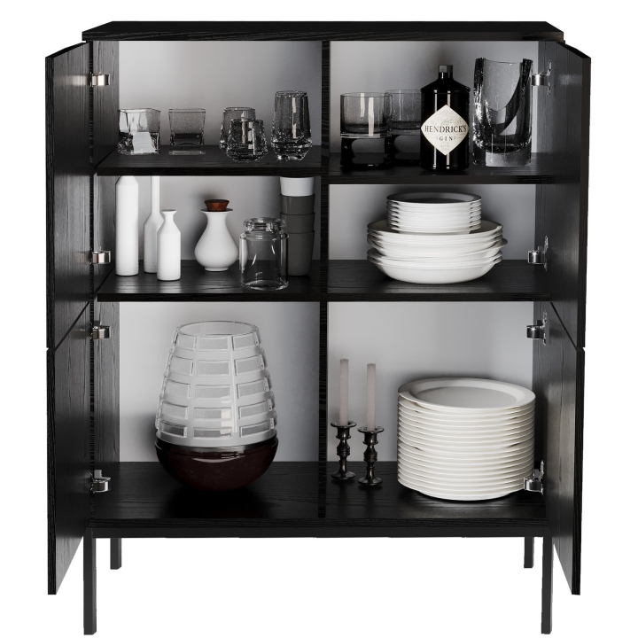 Wnętrze komody zaprojektowano z myślą o przejrzystej organizacji. Do dyspozycji użytkownika oddano 2 półki stałe oraz 2 półki regulowane, które można ustawiać na 3 różnych poziomach – zarówno pod, jak i nad półkami stałymi. Takie rozwiązanie pozwala dostosować układ do własnych potrzeb i przechowywać zarówno drobniejsze, jak i większe przedmioty.