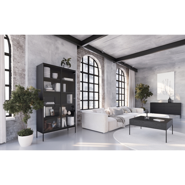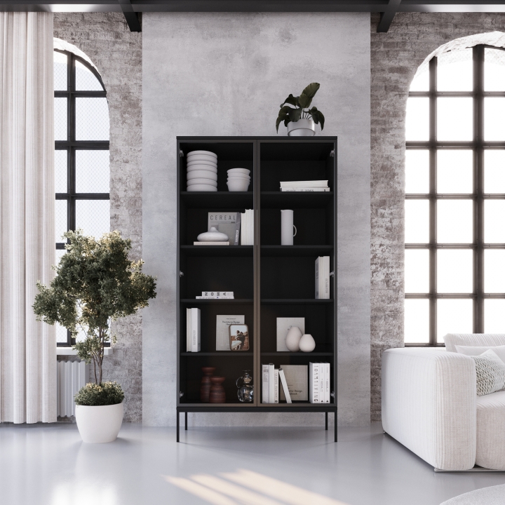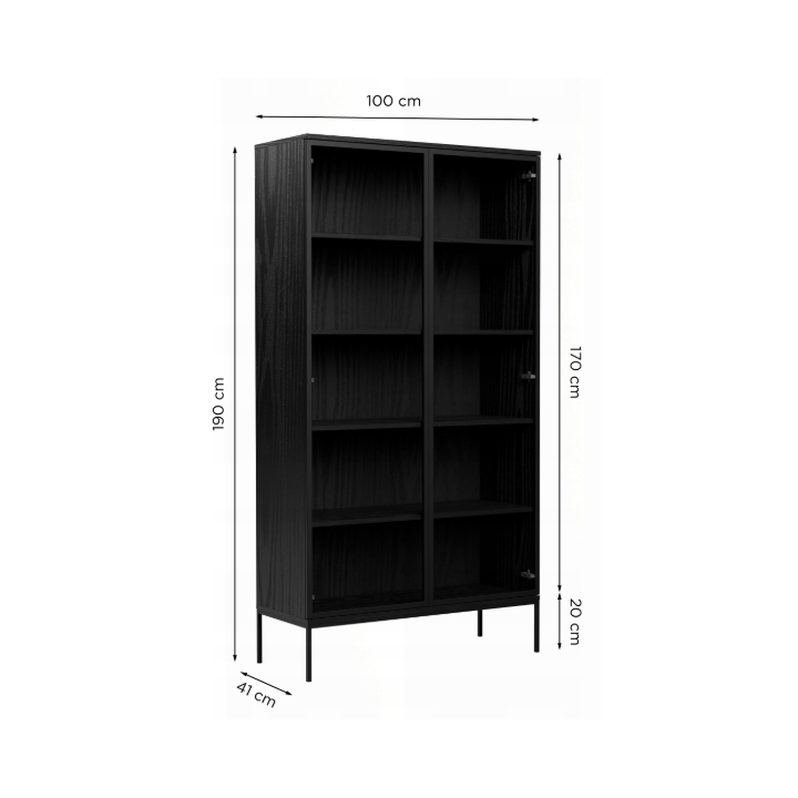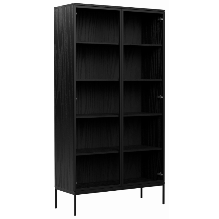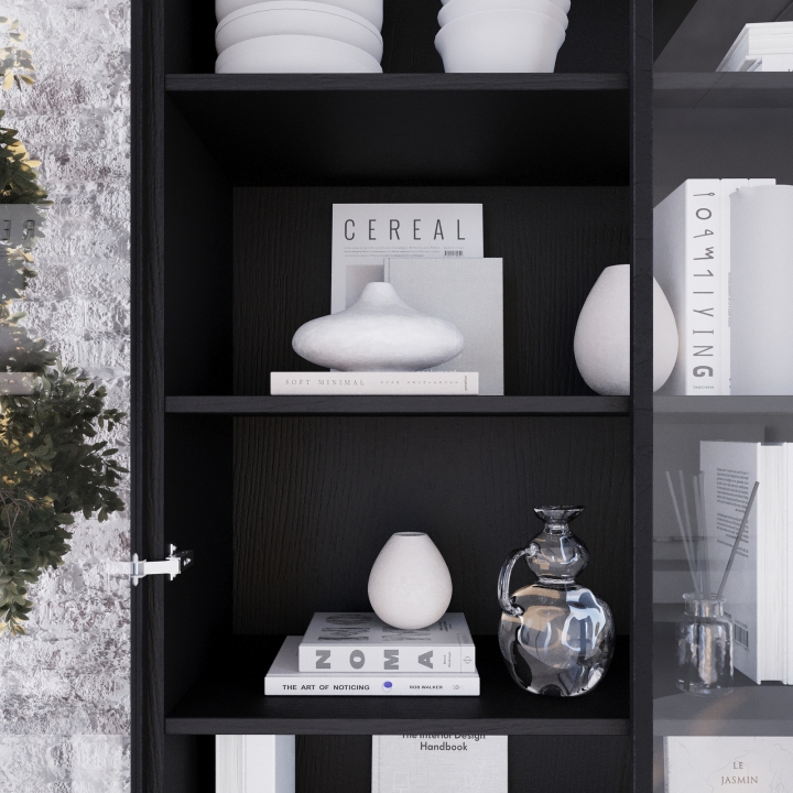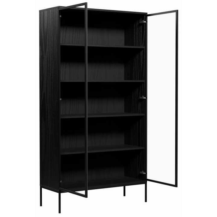 Korpus, półki oraz tylna ścianka zostały wykonane z płyty drewnopodobnej w kolorze czarnym, odwzorowującej naturalną strukturę drewna. Dzięki temu materiał prezentuje subtelne usłojenie, które nadaje mu naturalny wygląd. Witryna została wyposażona w 4 półki, umożliwiające przechowywanie książek, ozdób czy elementów dekoracyjnych.