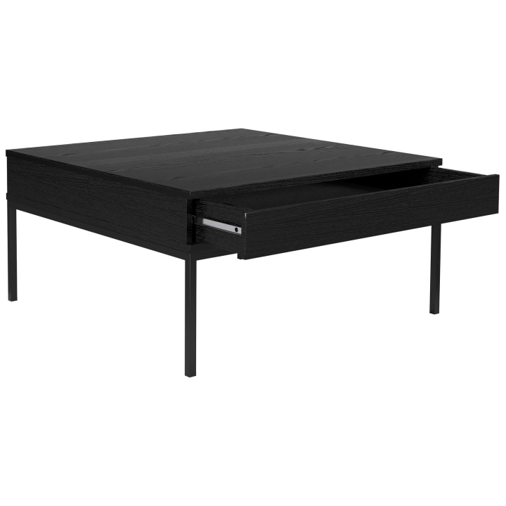 Stabilność mebla gwarantują nogi z metalowego profilu, których wysokość wynosi 30 cm. Ich prosta, czarna forma harmonizuje z płytą blatu, tworząc spójny i wyrazisty efekt wizualny. Dzięki temu ława dobrze komponuje się z różnymi aranżacjami salonu, od surowych loftów po bardziej współczesne przestrzenie.
