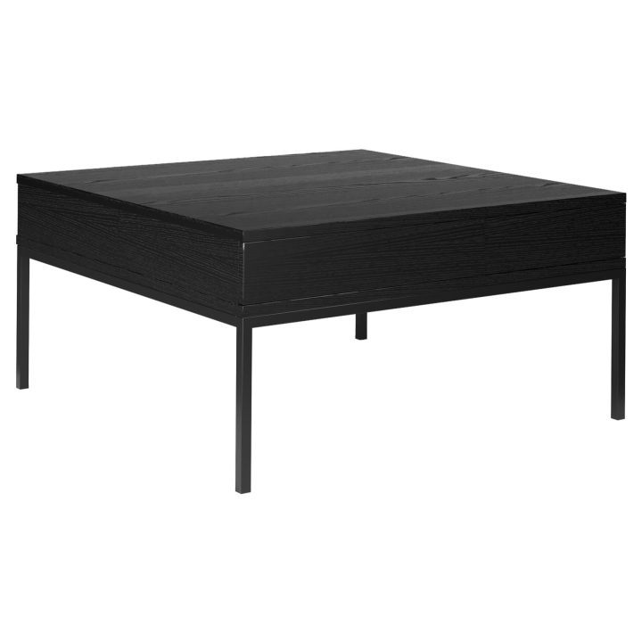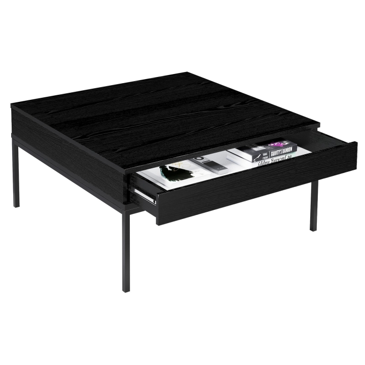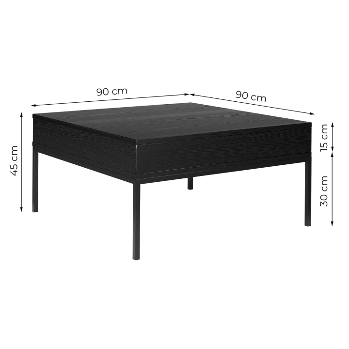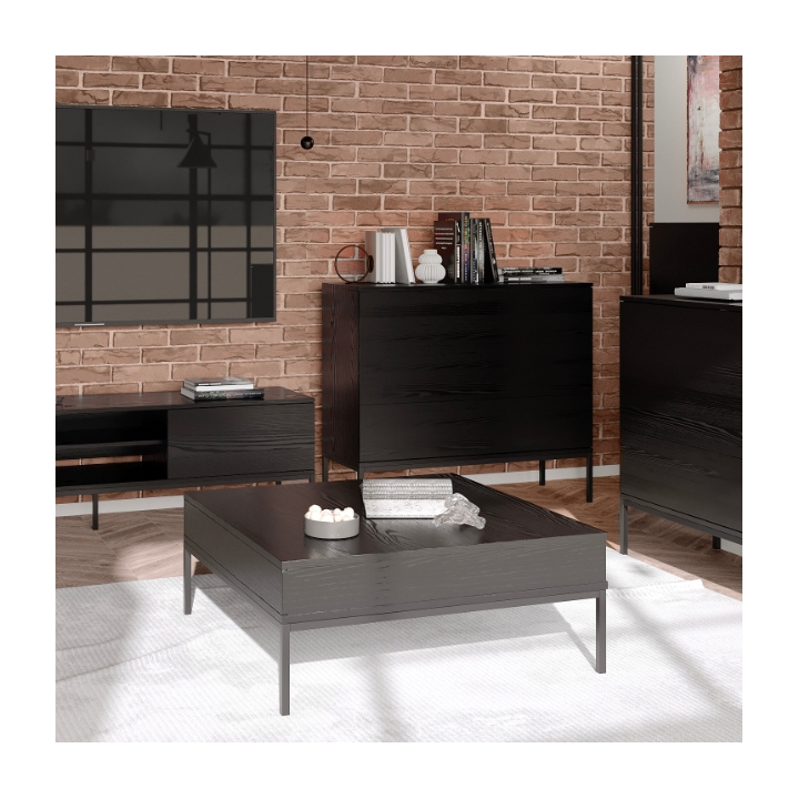 Ława 2S Indust Meli Meble to propozycja przeznaczona do wnętrz utrzymanych w estetyce industrialnej oraz nowoczesnej. Jej forma opiera się na prostym, geometrycznym blacie o wymiarach 90 x 90 cm, wykonanym z czarnej płyty meblowej, wiernie odwzorowującej naturalne drewno. Wyraźne usłojenie materiału nadaje powierzchni unikalnego charakteru i podkreśla głębię barwy.