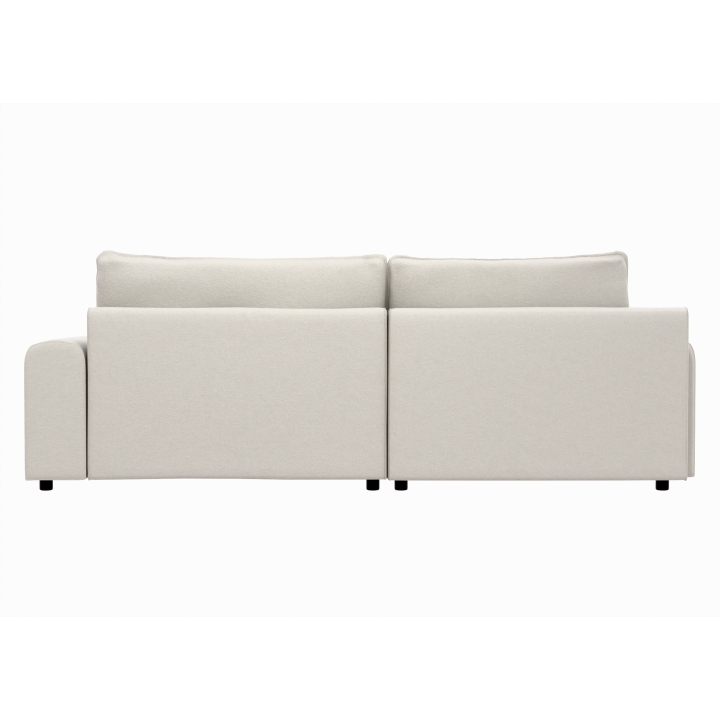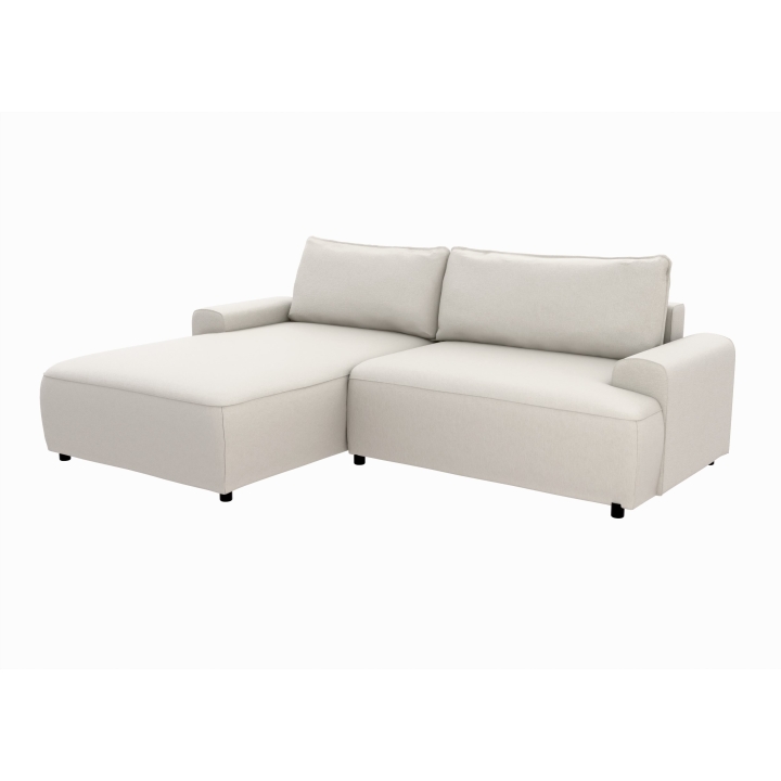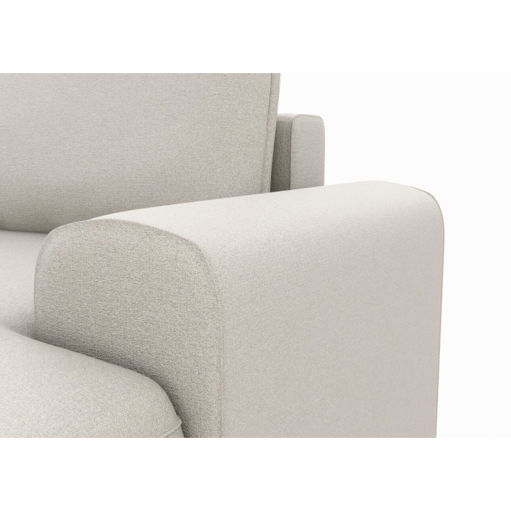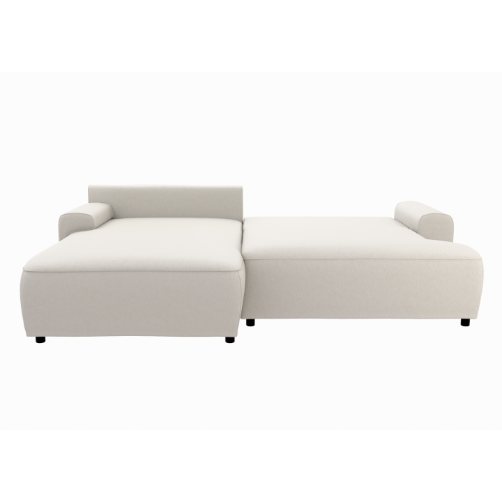 Całość wsparta jest na czarnych, matowych nogach z tworzywa sztucznego o wysokości 4,5 cm, które nadają stabilności i dyskretnego charakteru. Dzięki przemyślanej budowie narożnik zyskuje lekkość wizualną, mimo solidnej konstrukcji. Rozwiązanie to ułatwia także utrzymanie czystości pod meblem.