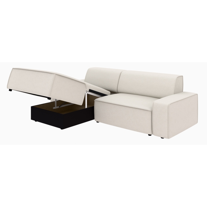Pod siedziskiem znajduje się pojemnik na pościel, który umożliwia przechowywanie kołdry, poduszek czy koców. Dzięki temu rozwiązaniu narożnik sprzyja utrzymaniu porządku w salonie. Pojemnik jest łatwo dostępny, co zwiększa wygodę codziennego użytkowania.