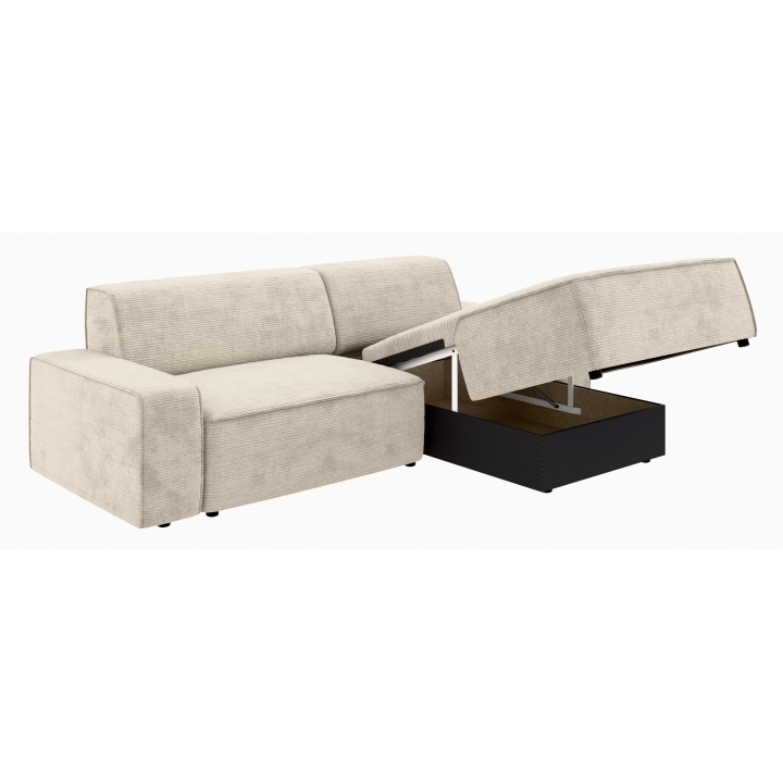 Pod siedziskiem znajduje się pojemnik na pościel, który umożliwia przechowywanie kołdry, poduszek czy koców. Dzięki temu rozwiązaniu narożnik sprzyja utrzymaniu porządku w salonie. Pojemnik jest łatwo dostępny, co zwiększa wygodę codziennego użytkowania.