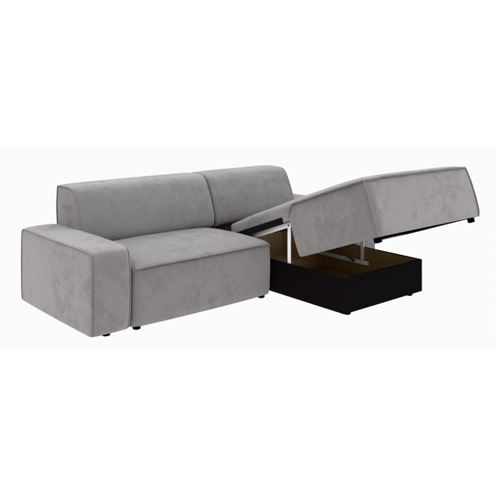 Pod siedziskiem znajduje się pojemnik na pościel, który umożliwia przechowywanie kołdry, poduszek czy koców. Dzięki temu rozwiązaniu narożnik sprzyja utrzymaniu porządku w salonie. Pojemnik jest łatwo dostępny, co zwiększa wygodę codziennego użytkowania.