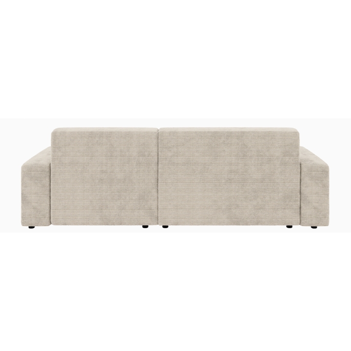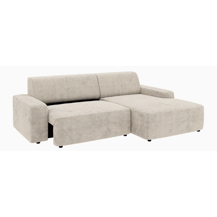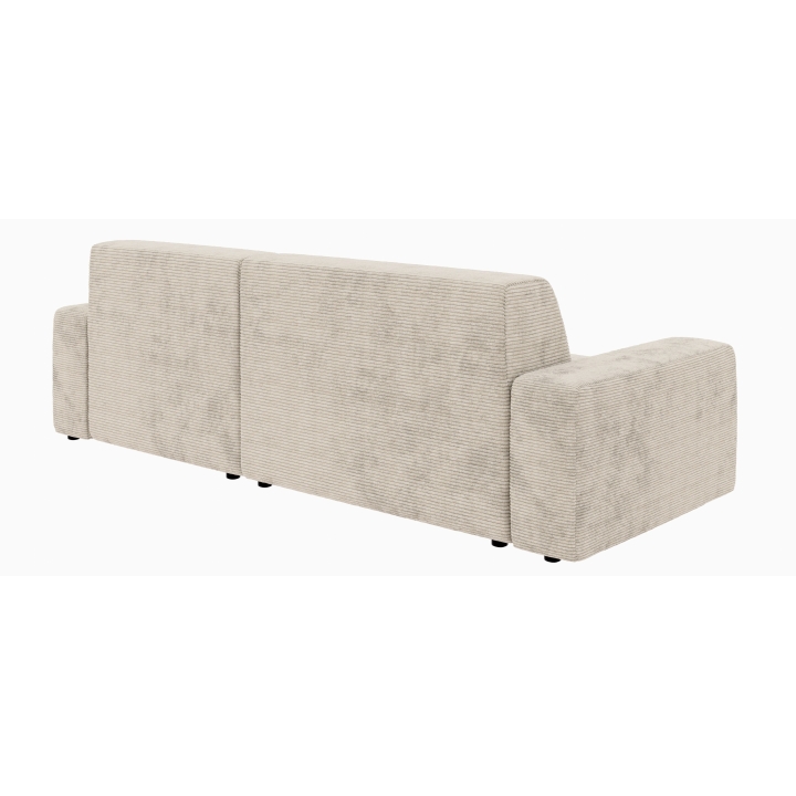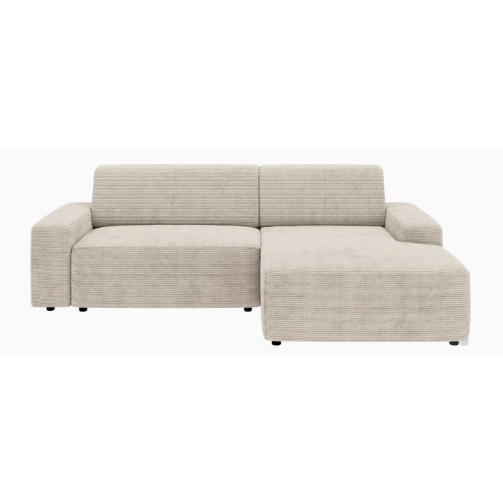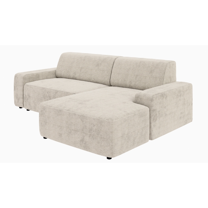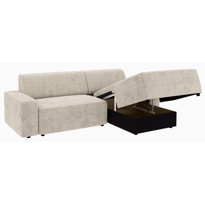 Siedzisko narożnika wykonano z pianki poliuretanowej standard oraz sprężyny falistej typu A, co zapewnia odpowiednie podparcie podczas odpoczynku. Oparcie składa się z pianki poliuretanowej oraz dodatkowej warstwy włókniny, dzięki czemu miękko dopasowuje się do sylwetki. Całość uzupełniają czarne, matowe nóżki o wysokości 4,5 cm wykonane z tworzywa.