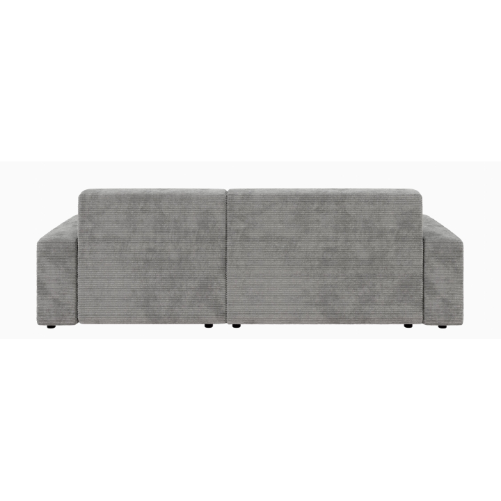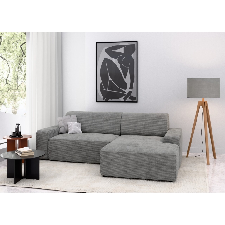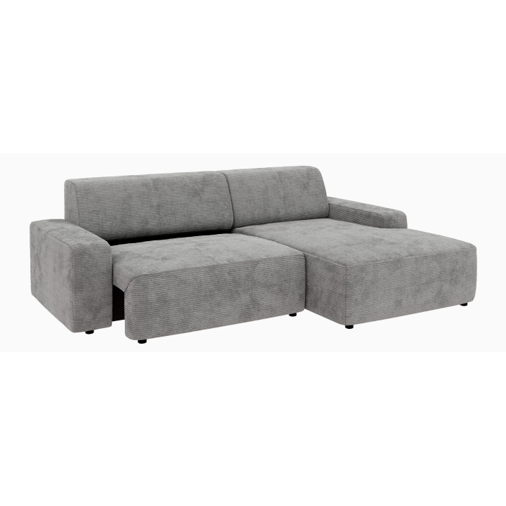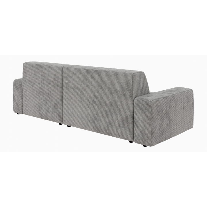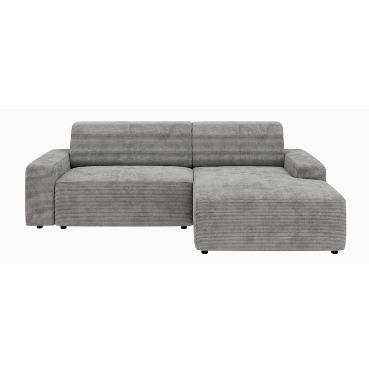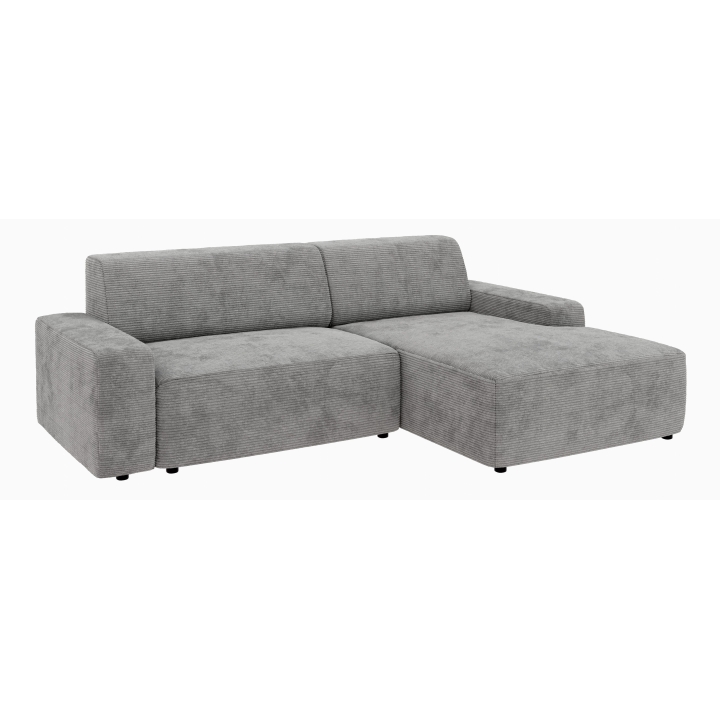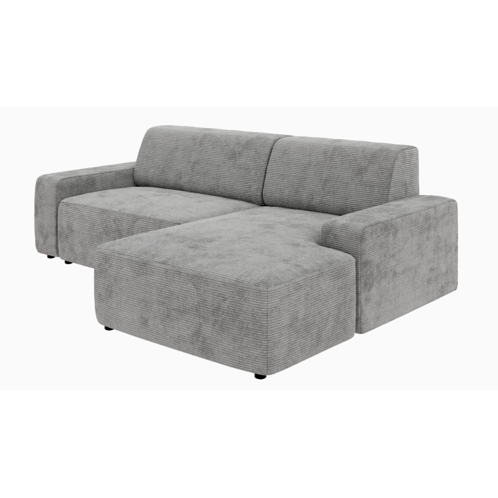 Siedzisko narożnika wykonano z pianki poliuretanowej standard oraz sprężyny falistej typu A, co zapewnia odpowiednie podparcie podczas odpoczynku. Oparcie składa się z pianki poliuretanowej oraz dodatkowej warstwy włókniny, dzięki czemu miękko dopasowuje się do sylwetki. Całość uzupełniają czarne, matowe nóżki o wysokości 4,5 cm wykonane z tworzywa.