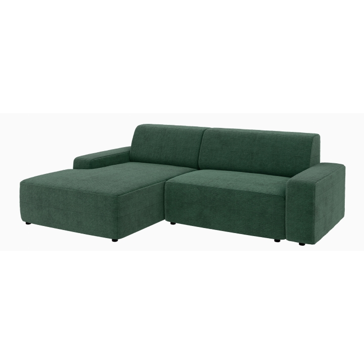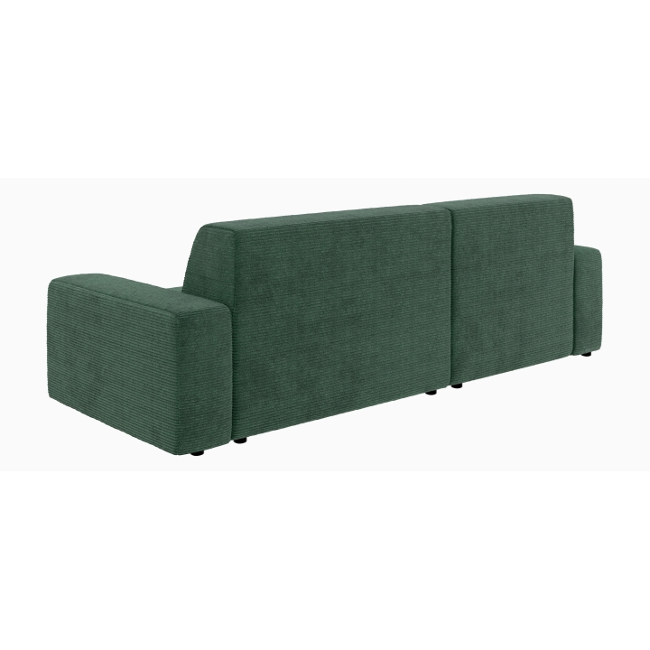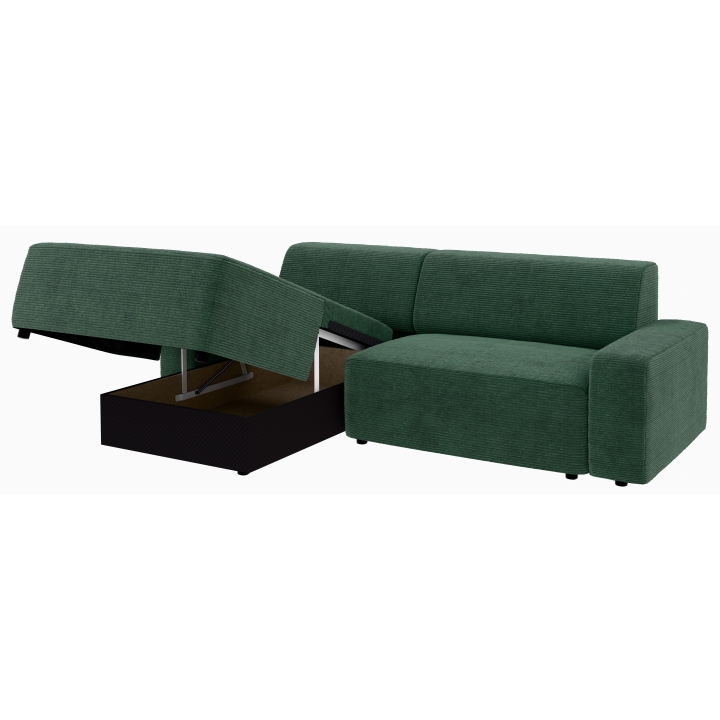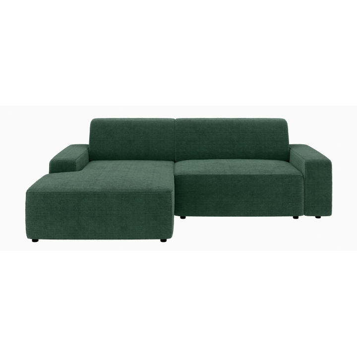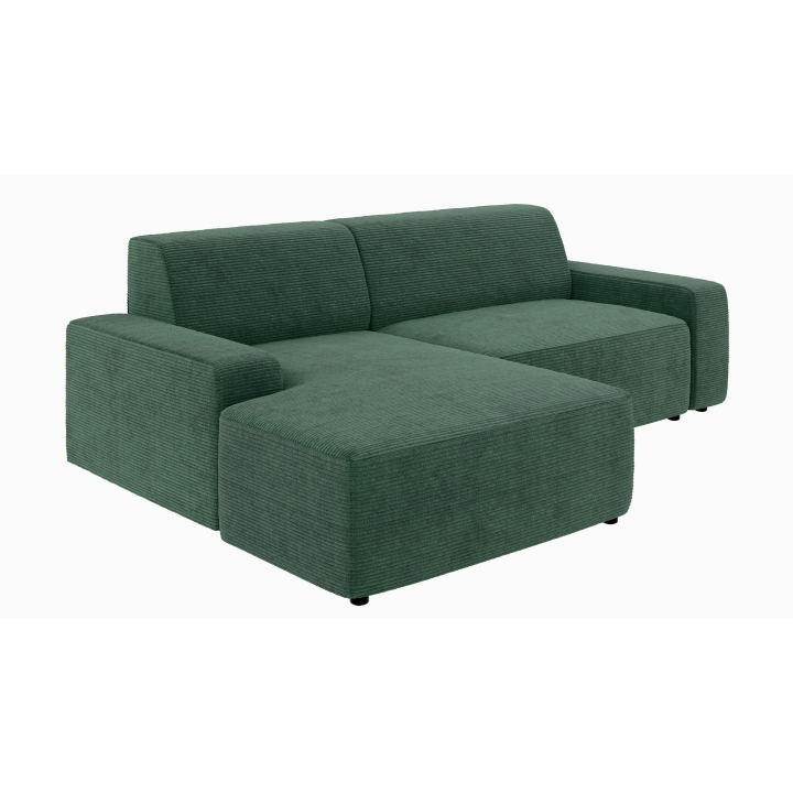 Siedzisko narożnika wykonano z pianki poliuretanowej standard oraz sprężyny falistej typu A, co zapewnia odpowiednie podparcie podczas odpoczynku. Oparcie składa się z pianki poliuretanowej oraz dodatkowej warstwy włókniny, dzięki czemu miękko dopasowuje się do sylwetki. Całość uzupełniają czarne, matowe nóżki o wysokości 4,5 cm wykonane z tworzywa.
