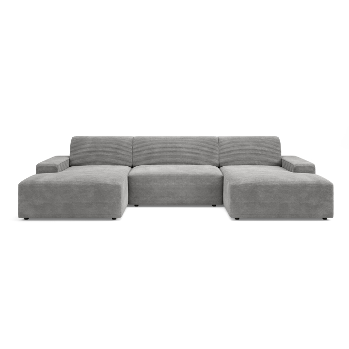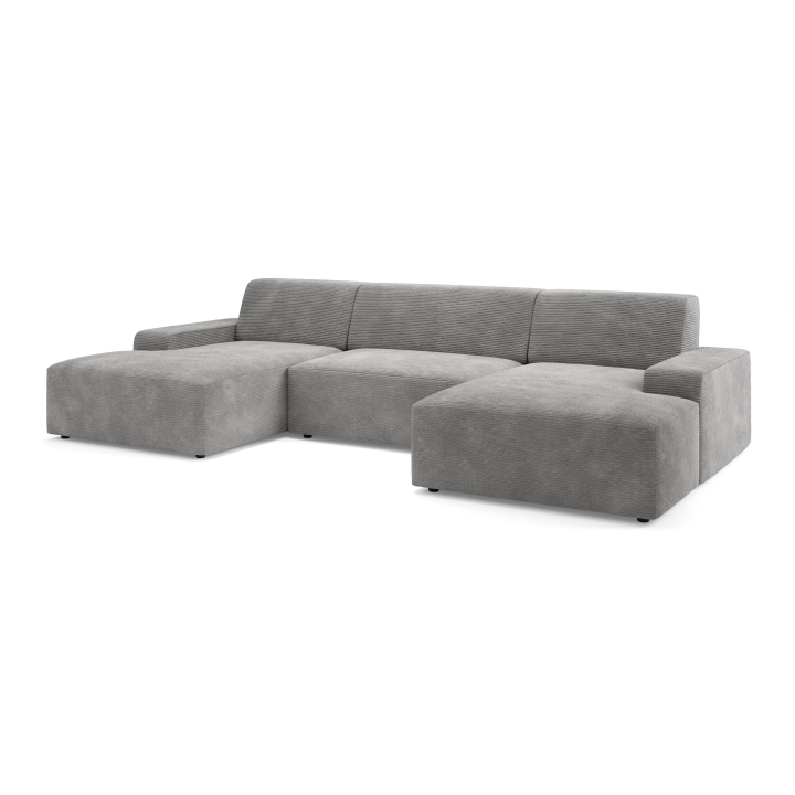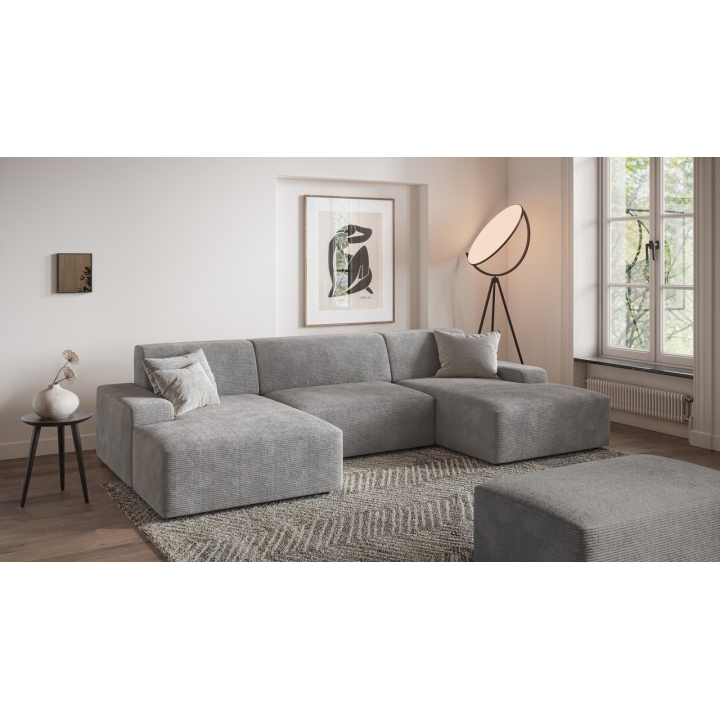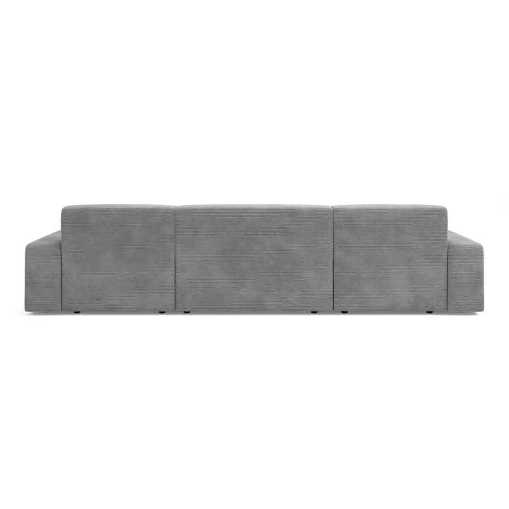 Atutem narożnika jest pojemnik na pościel, który może zostać umieszczony po lewej lub prawej stronie, w zależności od układu pomieszczenia. Dzięki temu mebel sprawdza się nie tylko jako centralny punkt salonu, lecz również jako rozwiązanie pozwalające utrzymać porządek i oszczędzić przestrzeń. Choć narożnik nie posiada funkcji spania, istnieje możliwość rozbudowy konfiguracji o puf, który uzupełnia lukę między szezlongami.