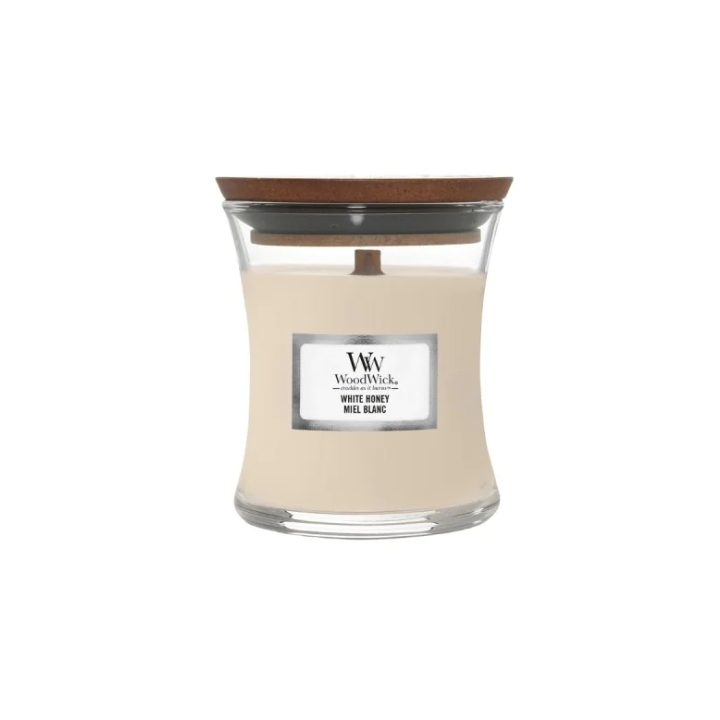 Mała świeca WoodWick White Honey to nastrojowe połączenie zapachu i dźwięku zamknięte w szklanym naczyniu o wadze 85g.
