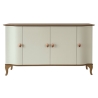 Wnętrze mebla kryje cztery drzwi wyposażone w zawiasy puszkowe ze spowalniaczem, które zapewniają ciche i płynne domykanie. Zastosowanie stalowych uchwytów w kolorze złotym nadaje całości wyrafinowanego akcentu, wprowadzając delikatny kontrast do naturalnej barwy korpusu. Stabilną podstawę tworzą nogi z litego drewna, gwarantujące trwałość konstrukcji oraz pewne oparcie.