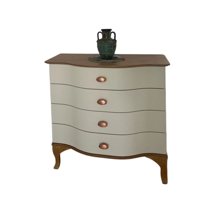 Mebel wyposażono w cztery pojemne szuflady, które ułatwiają uporządkowane przechowywanie różnego rodzaju przedmiotów. Zastosowane prowadnice z funkcją cichego domyku oraz niepełnym wysuwem gwarantują płynne i bezgłośne działanie. Uchwyty wykonane ze stali w kolorze złotym stanowią subtelny akcent nadający całości wyszukanego wyrazu.