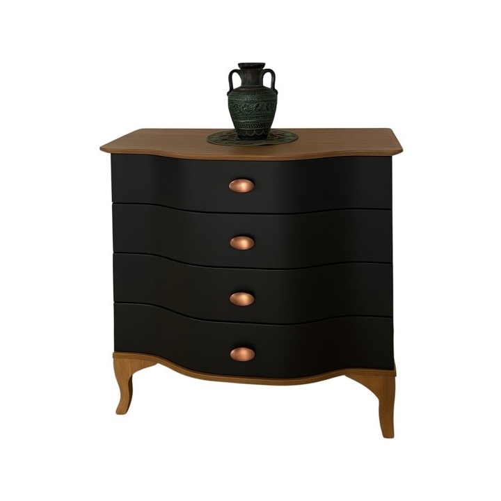 Mebel wyposażono w cztery pojemne szuflady, które ułatwiają uporządkowane przechowywanie różnego rodzaju przedmiotów. Zastosowane prowadnice z funkcją cichego domyku oraz niepełnym wysuwem gwarantują płynne i bezgłośne działanie. Uchwyty wykonane ze stali w kolorze złotym stanowią subtelny akcent nadający całości wyszukanego wyrazu.