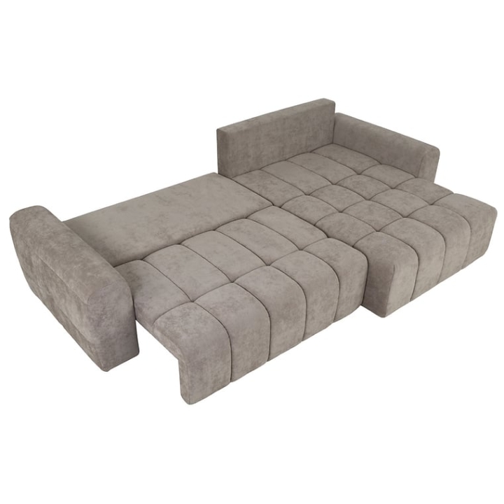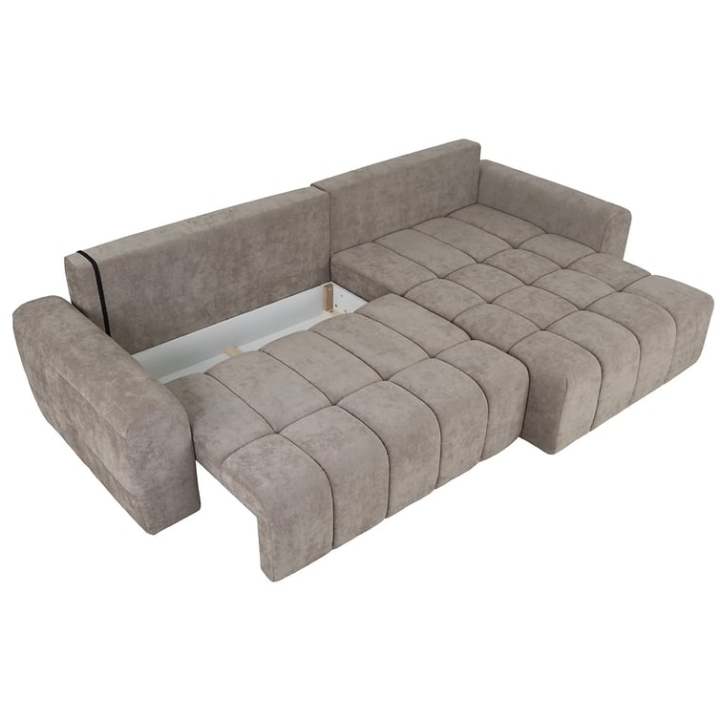 Model wyposażono w funkcję spania typu DL, która umożliwia łatwe przekształcenie mebla w łóżko. Mechanizm polega na wysunięciu siedziska do przodu i złożeniu oparcia, co tworzy równą powierzchnię spania o wymiarach 135x242 cm. Takie rozwiązanie pozwala w prosty sposób zmienić narożnik w komfortowe miejsce nocnego wypoczynku, bez potrzeby dodatkowych mebli.