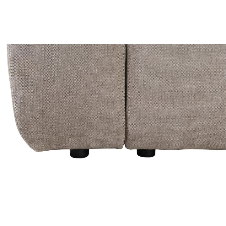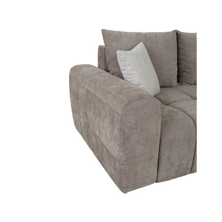 W zestawie znajdują się trzy duże poduszki oparciowe oraz trzy poduszki dekoracyjne, które podnoszą wygodę i nadają całości subtelnego uroku. Komfort siedziska i oparcia opiera się na połączeniu sprężyn falistych z pianką poliuretanową, co gwarantuje wyjątkową miękkość, odporność na odkształcenia. Siedzisko o szerokości 242 cm, umieszczone na wysokości 43 cm, z głębokością 86 cm, ozdobiono dekoracyjnymi przeszyciami, które tworzą efektowną, trójwymiarową strukturę.