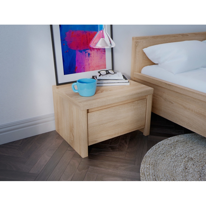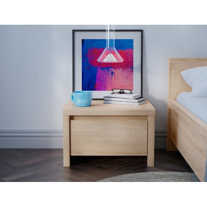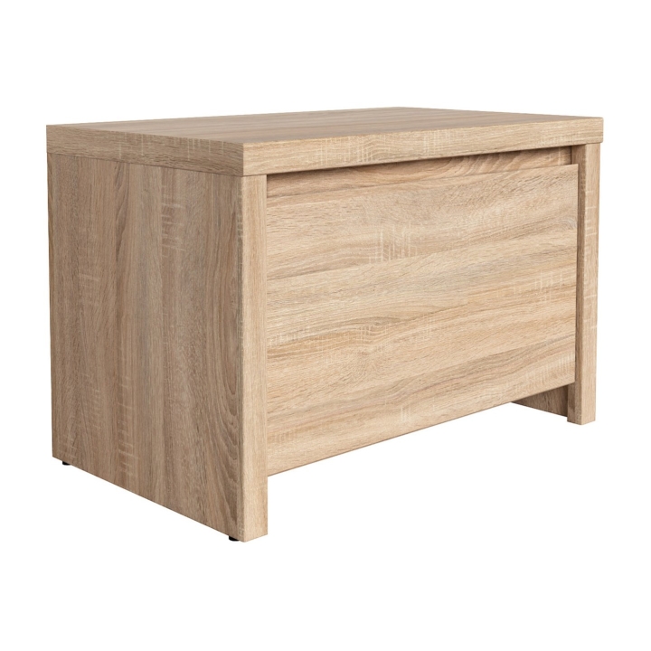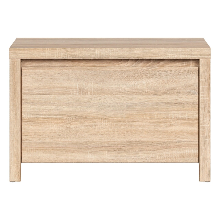 Szafka na buty Kaspian od Black Red White to kompaktowy mebel o szerokości 66 cm i wysokości 44,5 cm, idealny do niewielkich przedpokojów. Wykonana z płyty meblowej w dekorze dąb sonoma, nawiązuje do naturalnej kolorystyki drewna. Wyposażona w pojedynczy, uchylny front, umożliwia szybki dostęp do wnętrza i ułatwia codzienne użytkowanie. Otwarta przestrzeń wewnątrz pozwala uporządkować obuwie i zaoszczędzić miejsce na podłodze. Mebel waży 15,9 kg – jest stabilny, ale łatwy do przestawienia. Pogrubiane boki i blat zwiększają odporność konstrukcji na uszkodzenia mechaniczne. Dzięki neutralnemu wybarwieniu szafka dobrze komponuje się z innymi elementami systemu Kaspian, jak również z kolekcjami utrzymanymi w podobnej stylistyce. Może stanowić część zestawu z wieszakiem i lustrem lub funkcjonować samodzielnie jako praktyczne rozwiązanie do przechowywania codziennego obuwia.