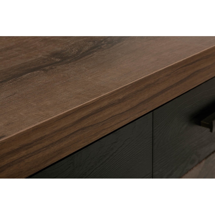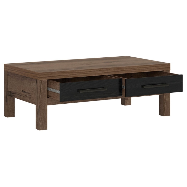 Ława Balin firmy Black Red White to sposób na to aby nowoczesne wnętrza były stylowo przełamane, a klasycznie odpowiednio podkreślone. To, co wyróżnia ławę Balin to nie tylko jej styl, ale także funkcjonalność. Na przestronnym blacie znajdzie się miejsce na filiżankę z kawą i efektowny wazon z kwiatami. Tuż pod blatem znajdziesz 2 praktyczne szuflady, które możesz wykorzystać do przechowywania czasopism, pilota lub innych, osobistych drobiazgów. Zwróć uwagę na efektowne zestawienie kolorystyczne korpusu dąb monastery i frontów w ciemnym odcieniu dąb czarny. Stabilność mebla zapewniają solidne nogi ławy, które korespondują z pogrubianymi bokami w korpusach pozostałych mebli z kolekcji. Możesz zestawić ławę do salonu z innymi elementami kolekcji Balin i stworzyć zachwycające aranżacje.