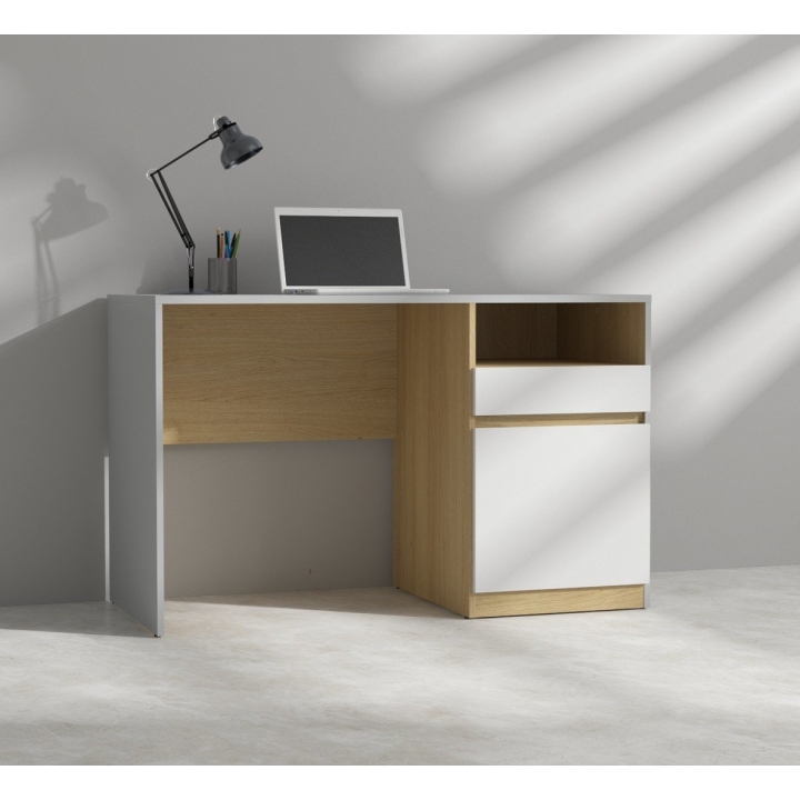 Czy szukasz idealnego biurka, które zainspiruje Twoje dziecko do nauki i kreatywności? Biurko Nandu to więcej niż zwykłe mebel - to centrum odkryć naukowych dla młodego umysłu. Stworzone z myślą o potrzebach nastolatków, łączy w sobie nowoczesny design i funkcjonalność. Jego długi blat zapewnia wystarczająco dużo miejsca na kreatywne projekty, a praktyczna szuflada i szafka pomieszczą wszystkie niezbędne przybory szkolne. Wytrzymałość biurka Nandu podkreśla lakierowany blat, odporny na zarysowania. Korpus w odcieniach szarego i dębu polskiego w połączeniu z białymi, połyskującymi frontami tworzy elegancki, a zarazem przyjazny dla oka wygląd. Dla tych, którzy chcą dodać odrobiny oryginalności, dostępna jest opcja frontu szuflady z unikatowym nadrukiem cyfrowym. Biurko to, bezuchwytowe i wyposażone w zawiasy z cichym domykiem, nie tylko ułatwia pracę, ale i podnosi komfort użytkowania. Tworząc pokój młodzieżowy z biurkiem Nandu i innymi elementami kolekcji, dajesz swojemu dziecku przestrzeń do nauki, rozrywki i rozwijania pasji. Biurko Nandu, z wymiarami 120 cm długości, 57 cm szerokości i 75,5 cm wysokości, idealnie wpasuje się w każde młodzieżowe wnętrze.