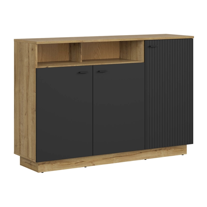 Za trzema drzwiami znajduje się przestrzeń podzielona półkami – każda z nich pozwala na przechowywanie rzeczy, które nie powinny leżeć na wierzchu: dokumenty, tekstylia, książki, drobna elektronika, pamiątki czy sezonowe dodatki. Układ wewnętrzny komody został zaplanowany tak, by nie trzeba było korzystać z dodatkowych organizerów. Masz wszystko w zasięgu ręki i zawsze w tym samym miejscu.