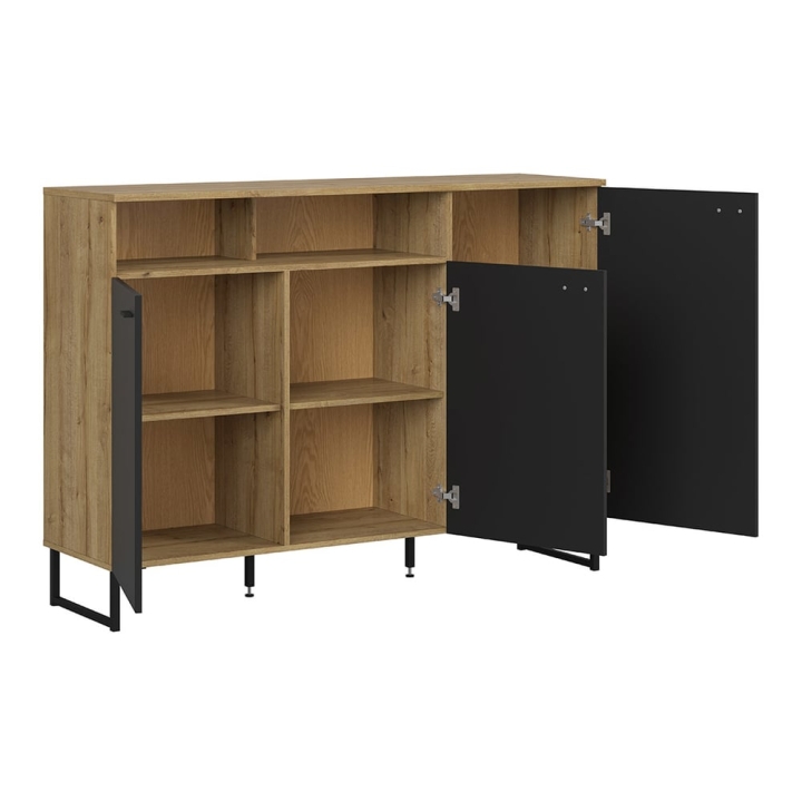 Komoda Zenda 150 cm z trzema drzwiami, otwartą półką i metalowymi nogami to mebel, który odpowiada na realne potrzeby: przechowywanie rzeczy w zamkniętej przestrzeni, łatwe sprzątanie pod meblem i wyrazisty wygląd, który nie ginie w tle.