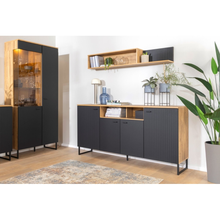 Korpus półki wykonano z trwałej płyty meblowej w kolorze dąb Waterford, który imituje naturalne drewno i dobrze współgra z innymi meblami z tej samej kolekcji. Dolna część została wykończona charakterystycznym frezowanym panelem – pionowe żłobienia na czarnym tle tworzą trójwymiarowy efekt. Ten detal nie tylko przyciąga wzrok, ale też podkreśla poziom staranności wykonania.