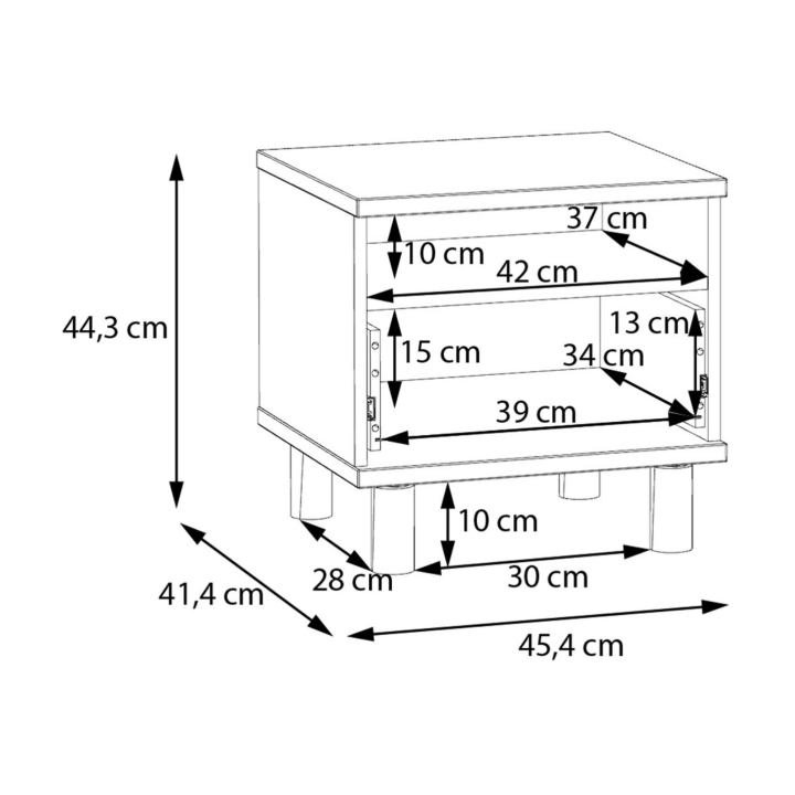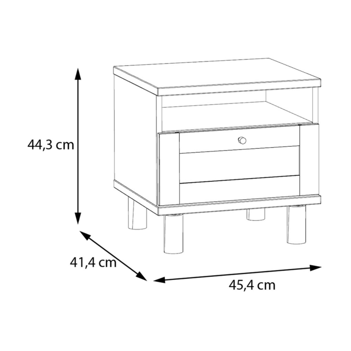 Szerokość 45,4 cm, głębokość 41,4 cm i wysokość 44,3 cm sprawiają, że szafka bez problemu mieści się obok łóżka, nie zajmując zbyt wiele miejsca. Na blacie zmieścisz lampkę, budzik, książkę lub ładowarkę – wszystko, co potrzebne wieczorem i rano. Dolna otwarta półka to idealna przestrzeń na czasopisma, etui na okulary lub inne drobiazgi, które chcesz mieć pod ręką, ale niekoniecznie na wierzchu.