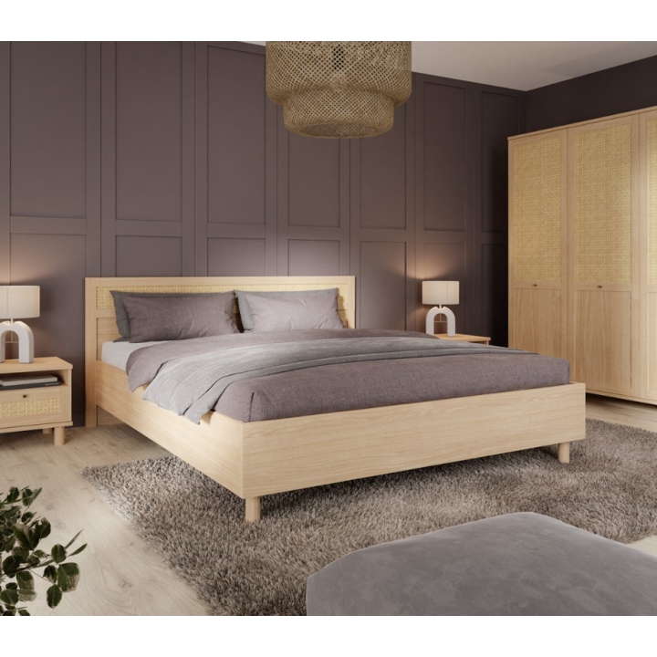 Cała konstrukcja opiera się na nogach z litego drewna dębowego, lakierowanego w naturalnym kolorze. Nogi są stabilne i delikatnie unoszą mebel nad podłogą, co ułatwia sprzątanie i dodaje wizualnej lekkości. Takie rozwiązanie sprawia, że mebel nie przytłacza – nawet w małych sypialniach.