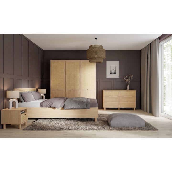 Szafka Caloroso świetnie komponuje się z łóżkiem, komodą czy szafą z tej samej kolekcji, tworząc spójną przestrzeń, w której każdy element pełni swoją funkcję. Ten model szczególnie dobrze odnajduje się w aranżacjach typu boho, japandi, naturalnych i soft loft.