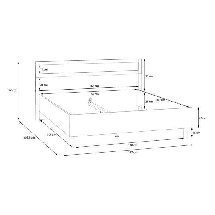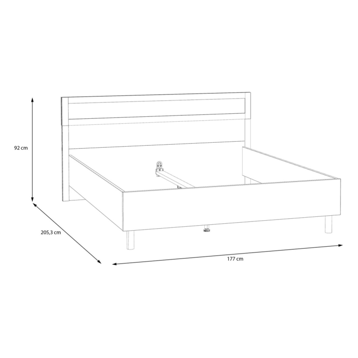 Szerokość całkowita łóżka to 177 cm, długość – 205,3 cm, wysokość do górnej krawędzi wezgłowia – 92 cm. Takie wymiary pozwalają ustawić mebel zarówno w większej sypialni, jak i w pomieszczeniu o średnim metrażu, bez utraty komfortu użytkowania.