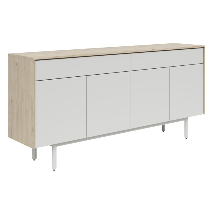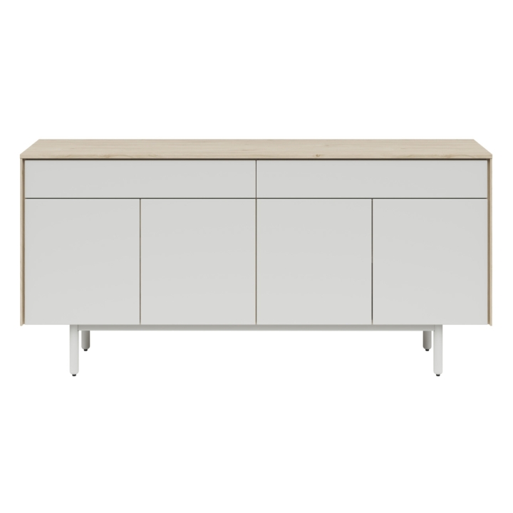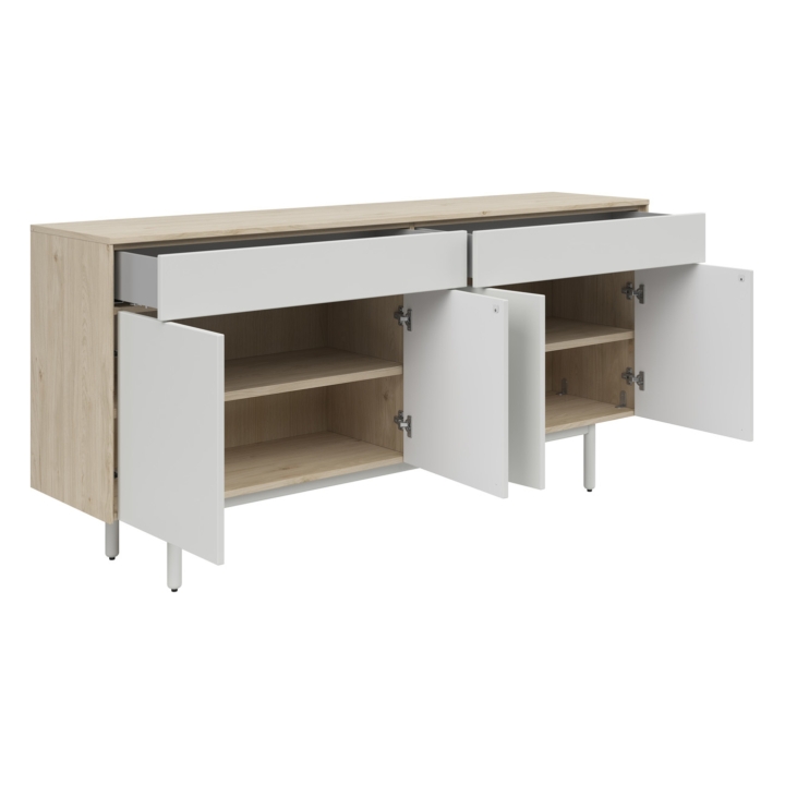 Szerokość 180 cm i wysokość 86 cm zapewniają dużą przestrzeń użytkową. Za pełnymi frontami kryją się cztery półki – idealne do przechowywania tekstyliów, dokumentów, zastawy stołowej lub zabawek. Dwie szerokie szuflady w górnej części pozwalają na szybki dostęp do drobiazgów codziennego użytku, takich jak ładowarki, klucze, drobne ubrania czy akcesoria biurowe. Wszystkie elementy otwierają się za pomocą systemu push to open – wystarczy lekko nacisnąć front, by uzyskać dostęp do wnętrza. Drzwi i szuflady domykają się bezgłośnie dzięki zastosowaniu mechanizmu cichego domyku.