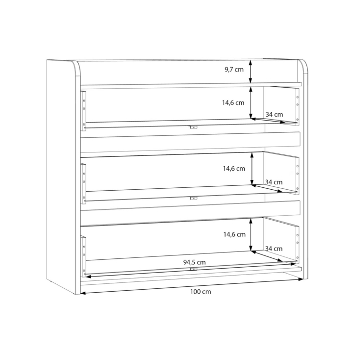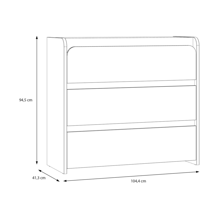 Komoda Hoa 104 cm to trafny wybór do pokoju młodzieżowego, w którym kluczowe znaczenie ma przemyślana organizacja i wyrazisty styl. Trzy szerokie szuflady rozmieszczone w równych odstępach pozwalają zachować porządek i szybko odnaleźć potrzebne rzeczy – od ubrań po sprzęt elektroniczny czy drobne akcesoria.