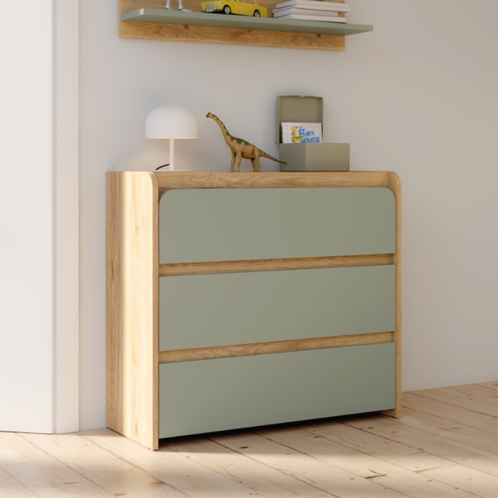 Komoda przyciąga wzrok naturalnym wybarwieniem dąb mauvella, które podkreśla strukturę drewna i dodaje wnętrzu wizualnego ciepła. Z kolei fronty w kolorze szałwia tworzą subtelny kontrast, który dobrze komponuje się z jasnymi ścianami, pastelowymi dodatkami czy naturalnymi materiałami. To zestawienie doskonale odnajduje się w aranżacjach inspirowanych stylem skandynawskim, boho, japandi czy eko.