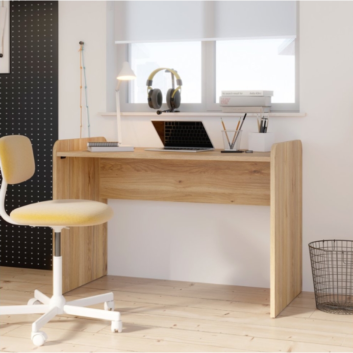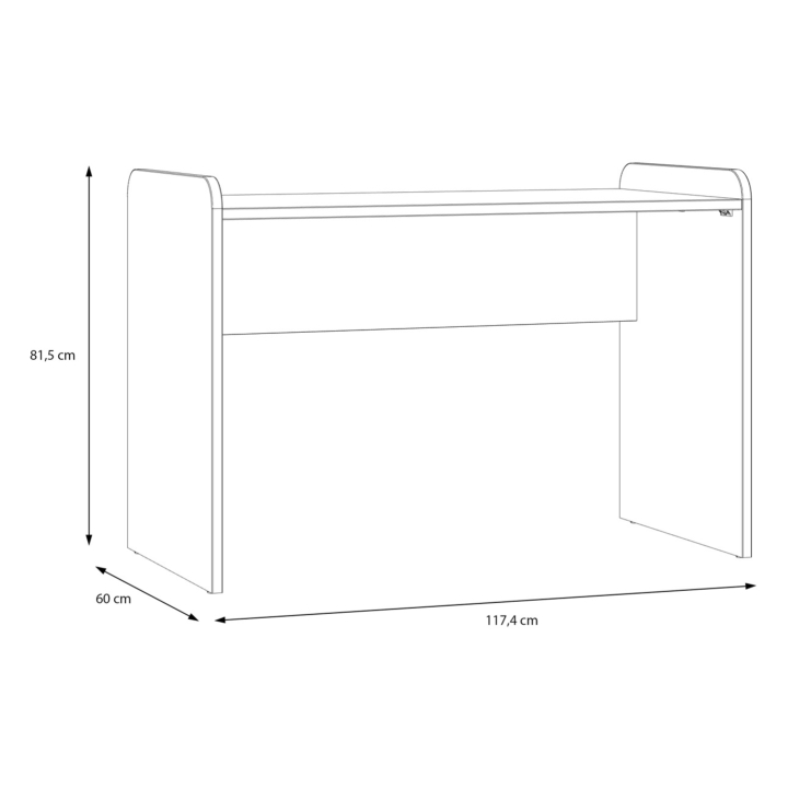 Szerokość blatu (117,4 cm) daje komfort podczas pracy przy komputerze, odrabiania lekcji czy korzystania z materiałów edukacyjnych. Głębokość 60 cm pozwala na wygodne rozłożenie zeszytów, podręczników czy tabletu, a pozostaje jeszcze przestrzeń na lampkę, kubek lub organizer. Biurko nie przytłacza wnętrza – jego forma pozostaje smukła i uniwersalna, dlatego zmieści się nawet w mniejszym pokoju.
