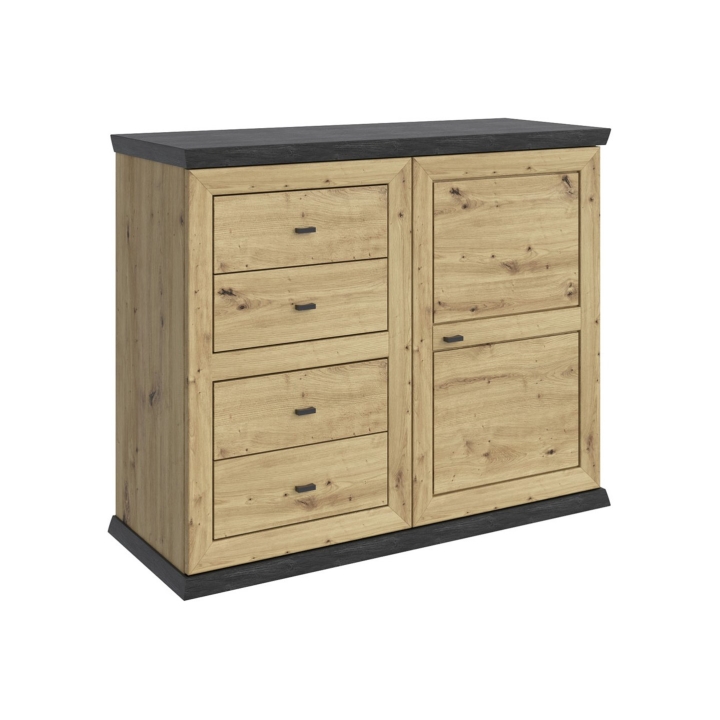 Estetykę komody podkreśla kolorystyka – korpus i fronty utrzymane są w dekorze dąb artisan, który odwzorowuje rysunek naturalnego drewna, nadając meblowi przytulny, autentyczny charakter. Ciemniejsze akcenty w kolorze delios pojawiają się na cokole i blacie, dodając elegancji i głębi całej bryle. Subtelne frezowania oraz minimalistyczne uchwyty doskonale dopełniają nowoczesny, ale uniwersalny styl komody.
