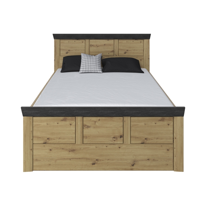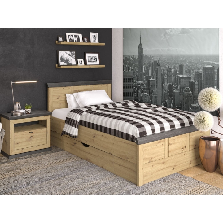 Wzornictwo łóżka to harmonijne połączenie ciepłego odcienia dąb artisan z kontrastującym, ciemnym dekorem delios, który pojawia się na cokole. Ta kolorystyczna gra przyciąga uwagę, a jednocześnie wprowadza do wnętrza naturalny klimat. Całość idealnie wpisuje się w aktualne trendy wnętrzarskie – zarówno te inspirowane stylem loftowym, jak i klasycznym czy skandynawskim.