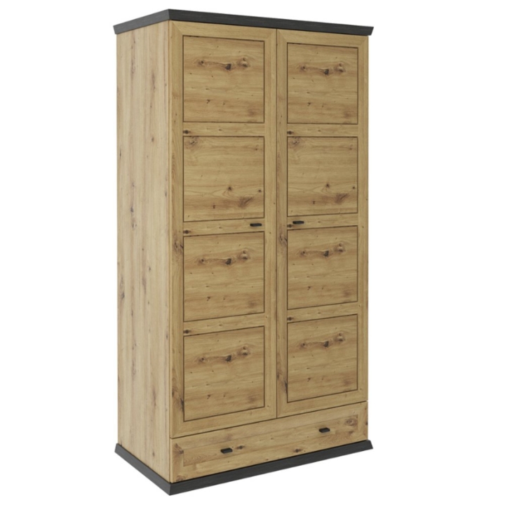 Design szafy Benton zachwyca od pierwszego spojrzenia. Masywna bryła została wykończona w dekorze dąb artisan, który doskonale odwzorowuje naturalny rysunek drewna – z widocznymi słojami i sękami. Ciepłe, naturalne wybarwienie wprowadza do wnętrza harmonię i przytulność. Dla kontrastu, górny wieniec i cokół wykończono w ciemnym kolorze delios, co dodaje meblowi elegancji i głębi.