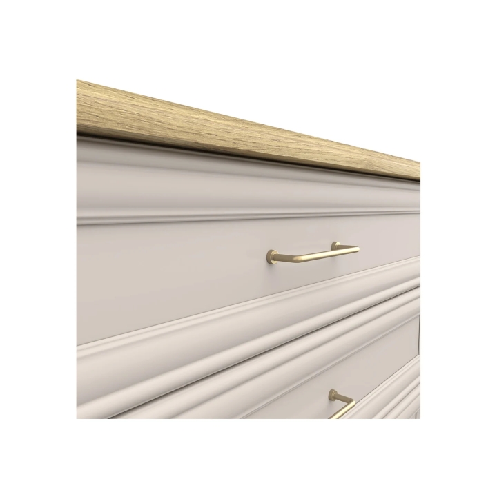 Komoda Anga 94 cm to mebel, który łączy stonowaną formę z detalami dodającymi wnętrzu charakteru. Fronty w kolorze kashmir, wykończone delikatnymi frezowaniami, nawiązują do trendu spokojnych, pastelowych wybarwień. Blat w dekorze dąb mauvella przełamuje jednolitość frontów, wnosząc do aranżacji nutę ciepła inspirowaną naturą. Całość dopełniają uchwyty w odcieniu szczotkowanego złota, które dodają subtelnego akcentu bez dominowania nad formą mebla.