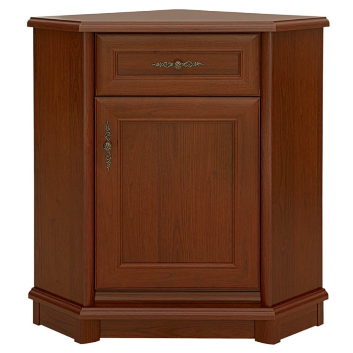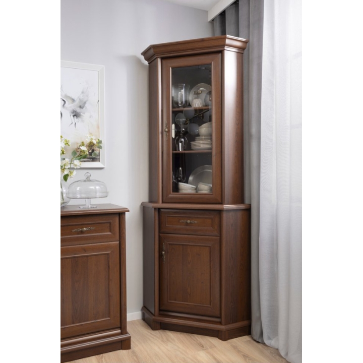 Estetykę mebla podkreślają dekoracyjne detale: rzeźbiony cokół, frezowane fronty oraz stylizowany uchwyt o biżuteryjnym charakterze. Złoty odcień gałki dodaje całości szlachetnego akcentu i subtelnie kontrastuje z ciemnym odcieniem kasztanu. Te elementy nie tylko zdobią, ale też budują spójny styl – rozpoznawalny dla całej serii Kent.