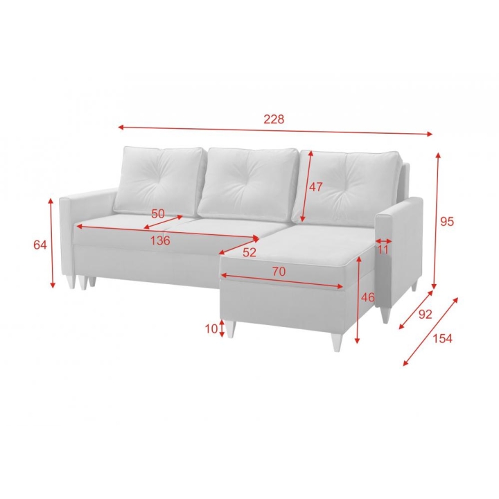 Mebel posiada wymiary: szerokość 228 cm, głębokość 154 cm, wysokość 93 cm, dzięki czemu sprawdzi się zarówno w przestrzeniach dziennych, jak i wypoczynkowych. Wysokość siedziska 46 cm sprzyja wygodnej pozycji podczas korzystania, a cała bryła została zaprojektowana z uwzględnieniem optymalnych proporcji użytkowych. Mechanizm spania typu system rolkowy umożliwia płynne i intuicyjne rozkładanie.