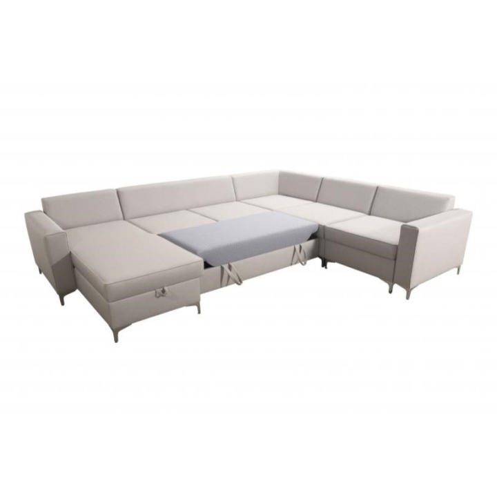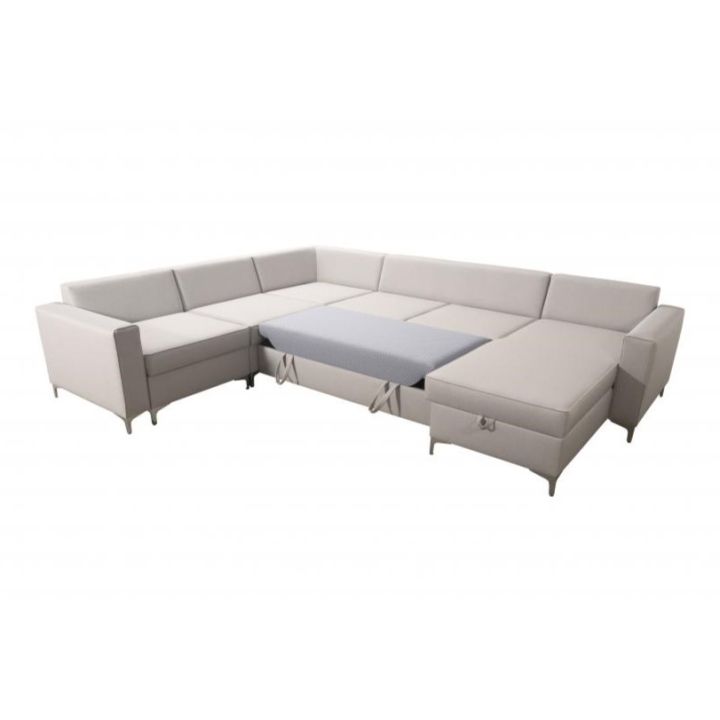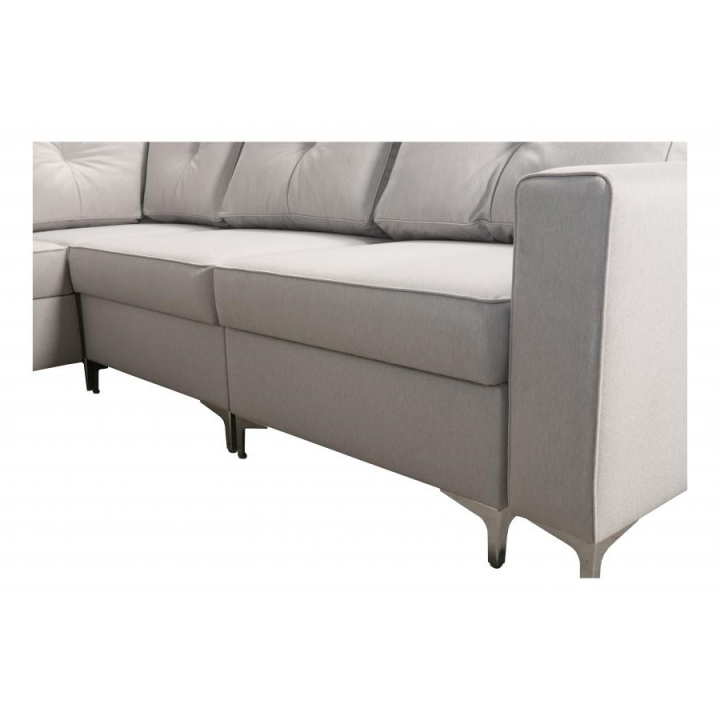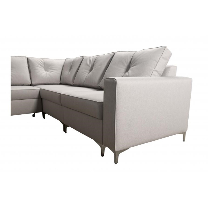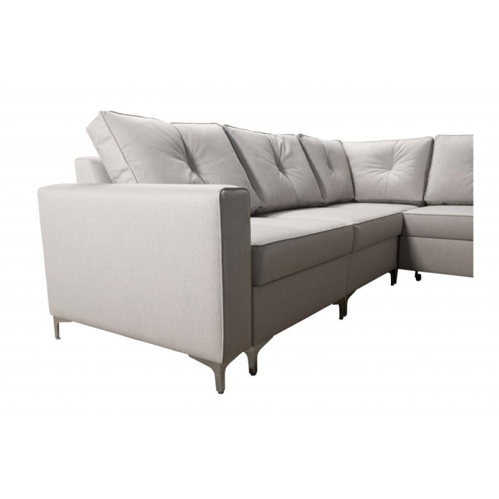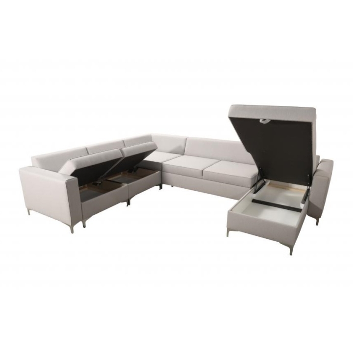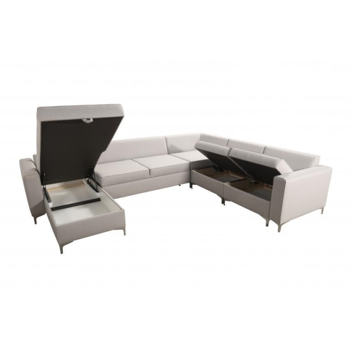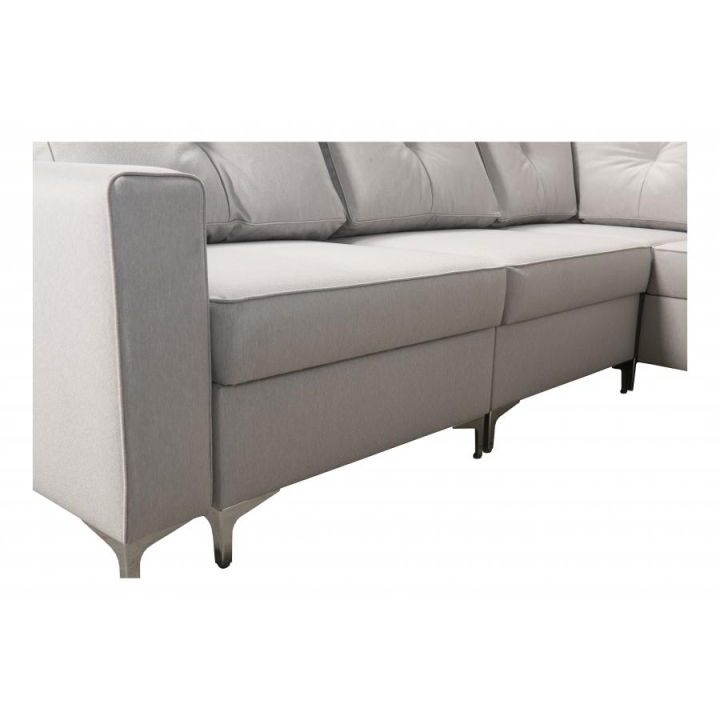 Wyposażenie Adonero V obejmuje 3 pojemniki na pościel, oferujące znaczną przestrzeń do przechowywania. Do narożnika dołączone są poduszki widoczne na zdjęciu, przy czym należy mieć na uwadze, że nie istnieje opcja wykonania poduszek na zamek. Klient może dokonać wyboru pomiędzy metalowymi chromowanymi stopkami a drewnianymi dostępnymi w kolorach: czarny, biały, olcha, venge i buk.