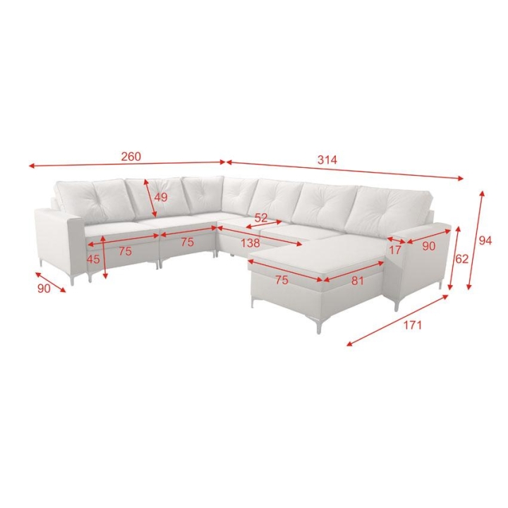 Narożnik Adonero V Brattex to mebel wypoczynkowy o imponujących parametrach, który idealnie wpisuje się w potrzeby obszernej przestrzeni mieszkalnej. Całkowita szerokość tego modelu wynosi 314 cm, a jego głębokość osiąga 260 cm. Układ mebla jest asymetryczny; krótszy bok liczy 171 cm, natomiast długość dłuższego boku wynosi 260 cm.