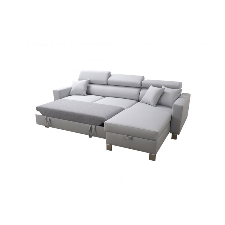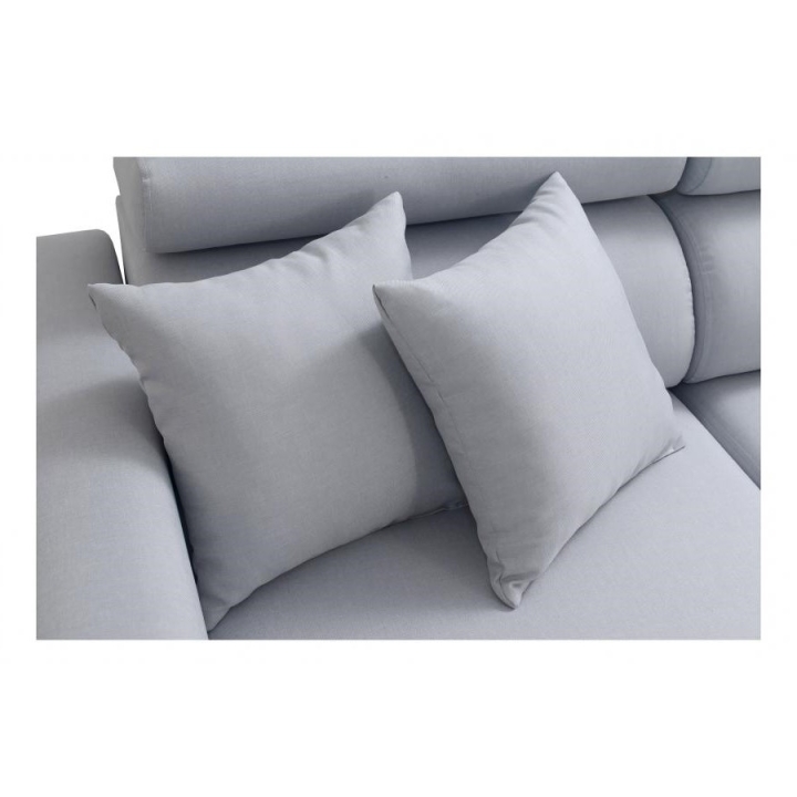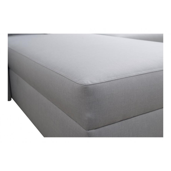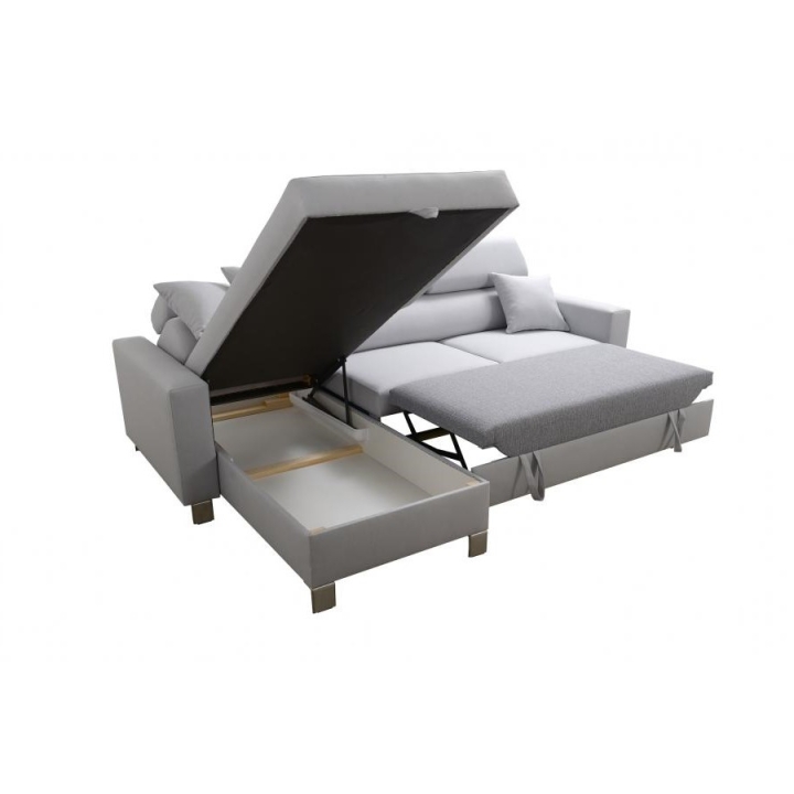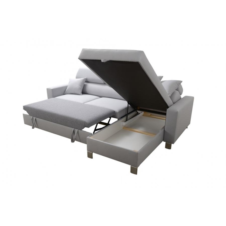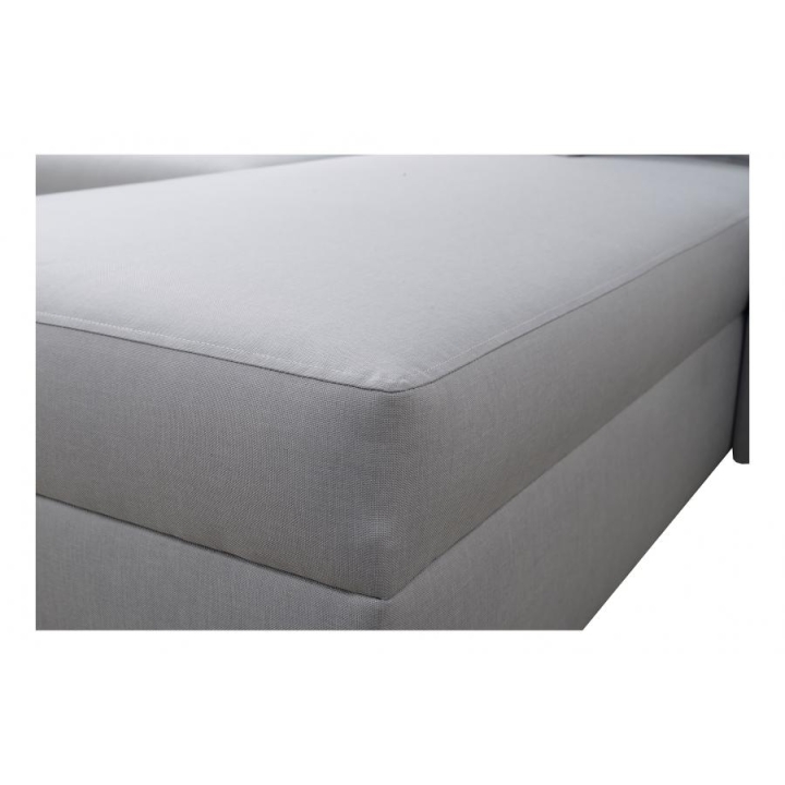 Mebel został wyposażony w funkcję spania, która po rozłożeniu oferuje powierzchnię 210x127 cm, stanowiącą wygodne miejsce do nocnego wypoczynku. Dodatkowo, pod jedną z części narożnika znajduje się 1 pojemnik na pościel, co ułatwia utrzymanie porządku i optymalne wykorzystanie dostępnej przestrzeni. W cenie narożnika zawarte są również poduszki widoczne na zdjęciu.