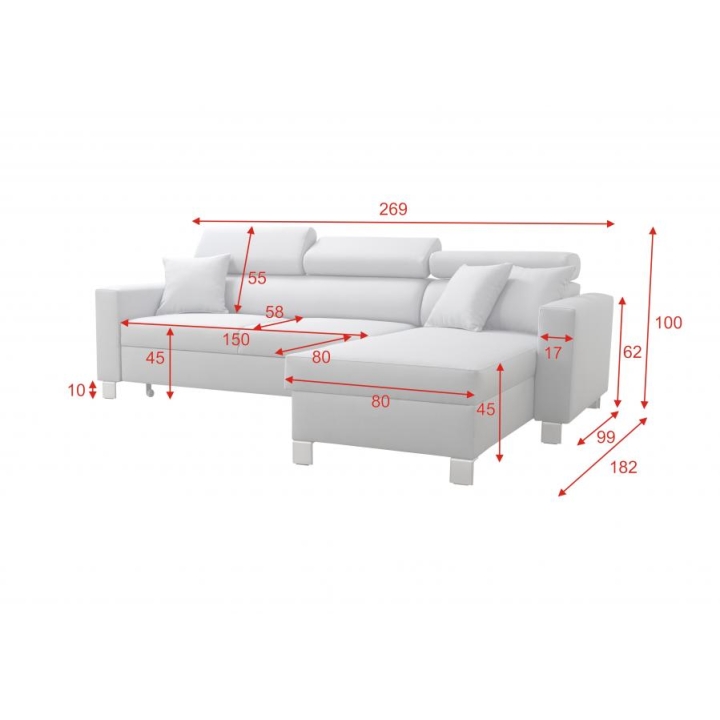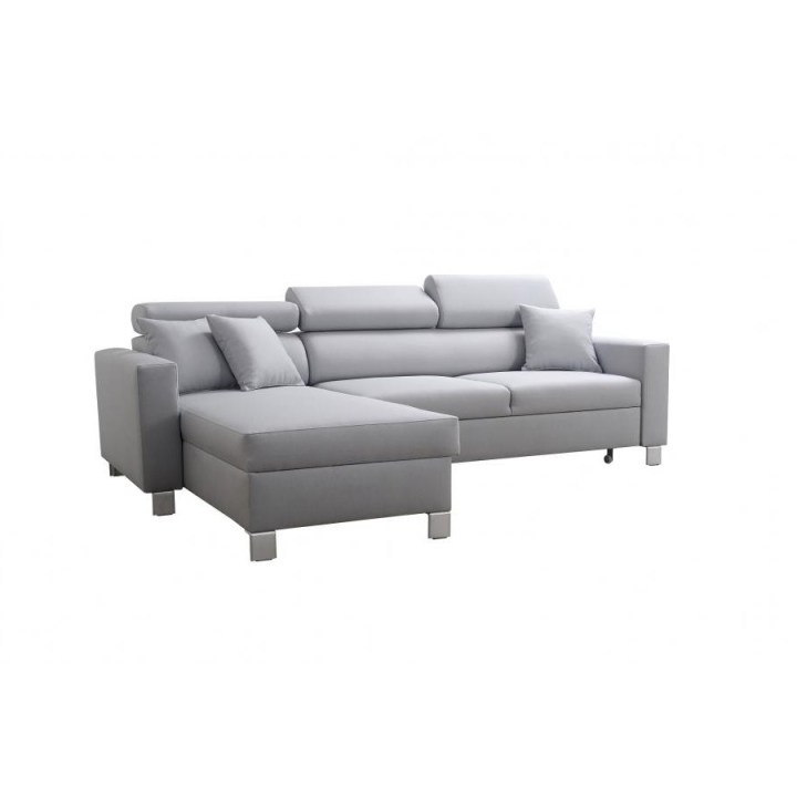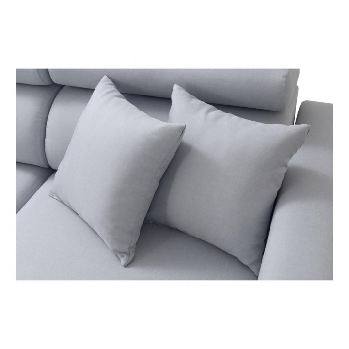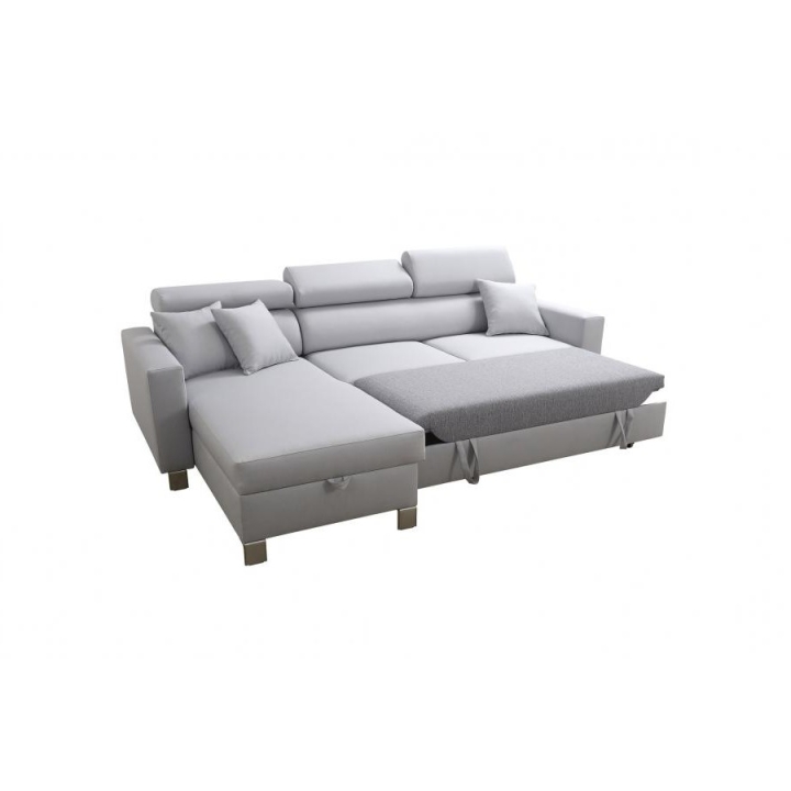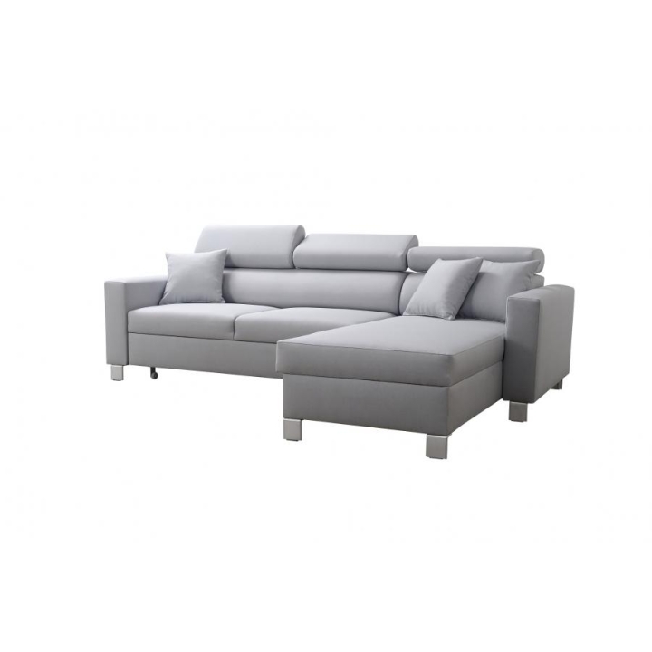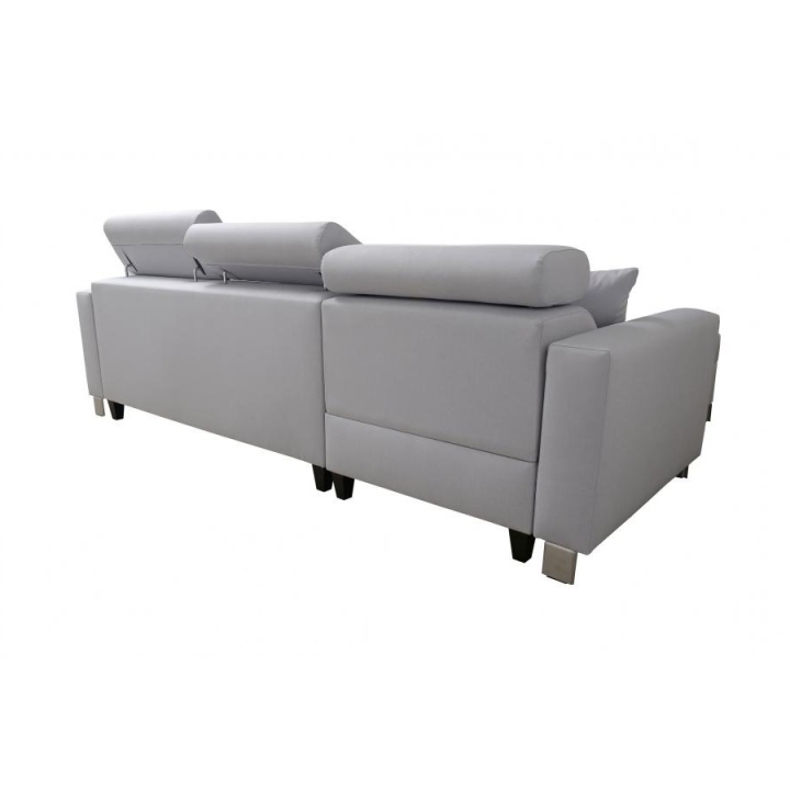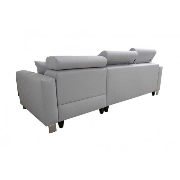Mebel został wyposażony w funkcję spania, która po rozłożeniu oferuje powierzchnię 210x127 cm, stanowiącą wygodne miejsce do nocnego wypoczynku. Dodatkowo, pod jedną z części narożnika znajduje się 1 pojemnik na pościel, co ułatwia utrzymanie porządku i optymalne wykorzystanie dostępnej przestrzeni. W cenie narożnika zawarte są również poduszki widoczne na zdjęciu.